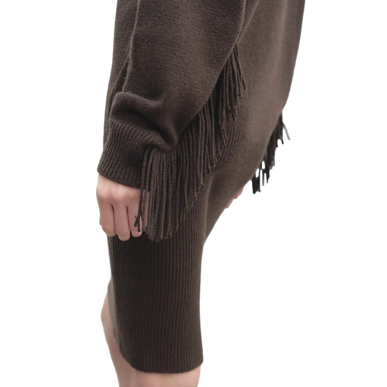 This short dress by Akep captures the eye with its strong visual impact, embellished with dynamic fringes that add movement and personality. The clean cut is paired with bold details, ideal for those who love to stand out with style. Crafted from a warm fabric, it's perfect for facing the winter with elegance and comfort. Versatile and sophisticated, it's perfect for evening looks or special events. Pair with high boots or pumps for a bold and feminine effect.