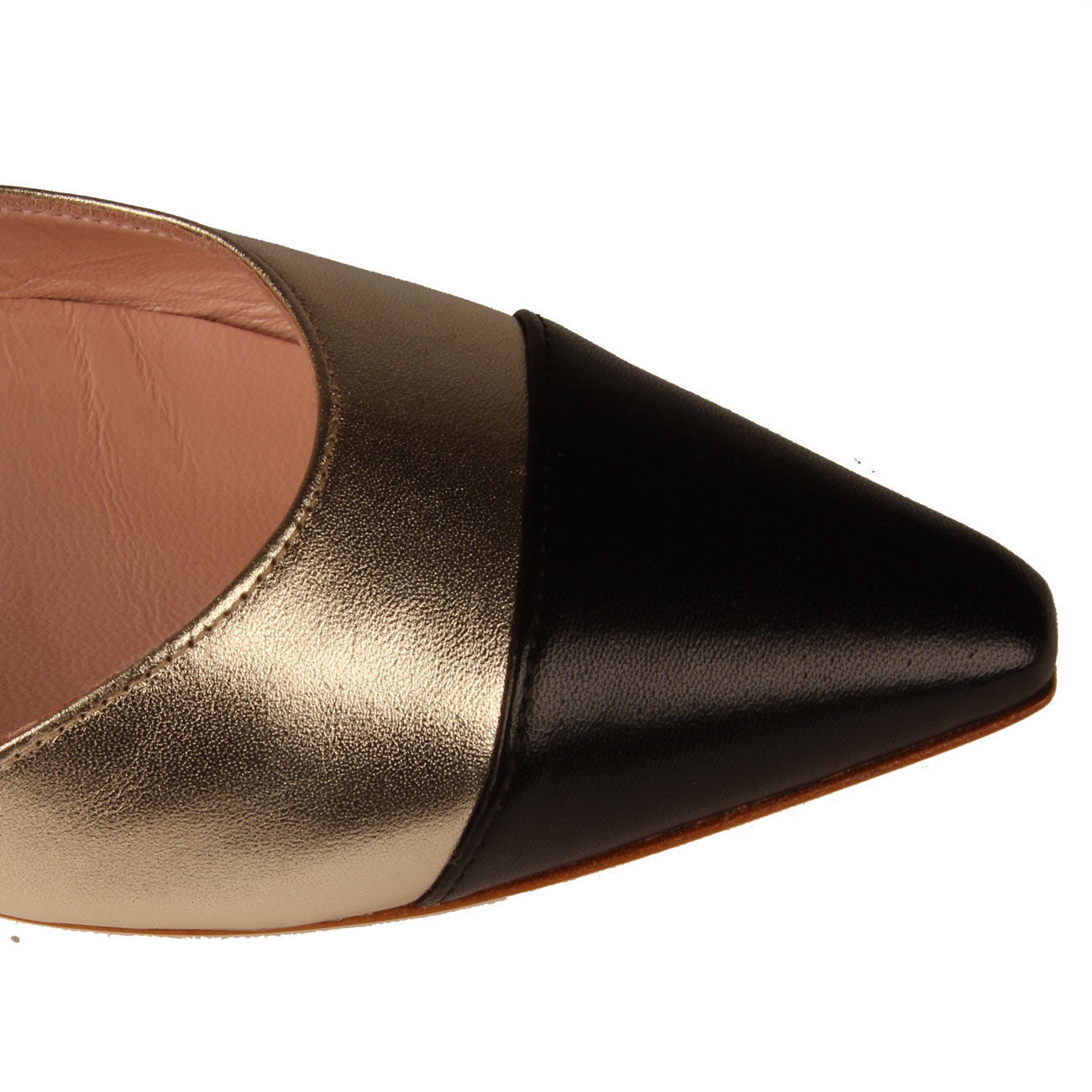 Low sandal with open heel in golden tone with black toe. Wear them to complete an elegant and sophisticated outfit!