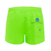 Solid color swimsuit with two-tone inserts on the back, with drawstring drawstring adjustable waist, two side pockets, a patch back pocket with closed flap, an internal mesh bottom and the embroidered logo on the front and patched on the back.