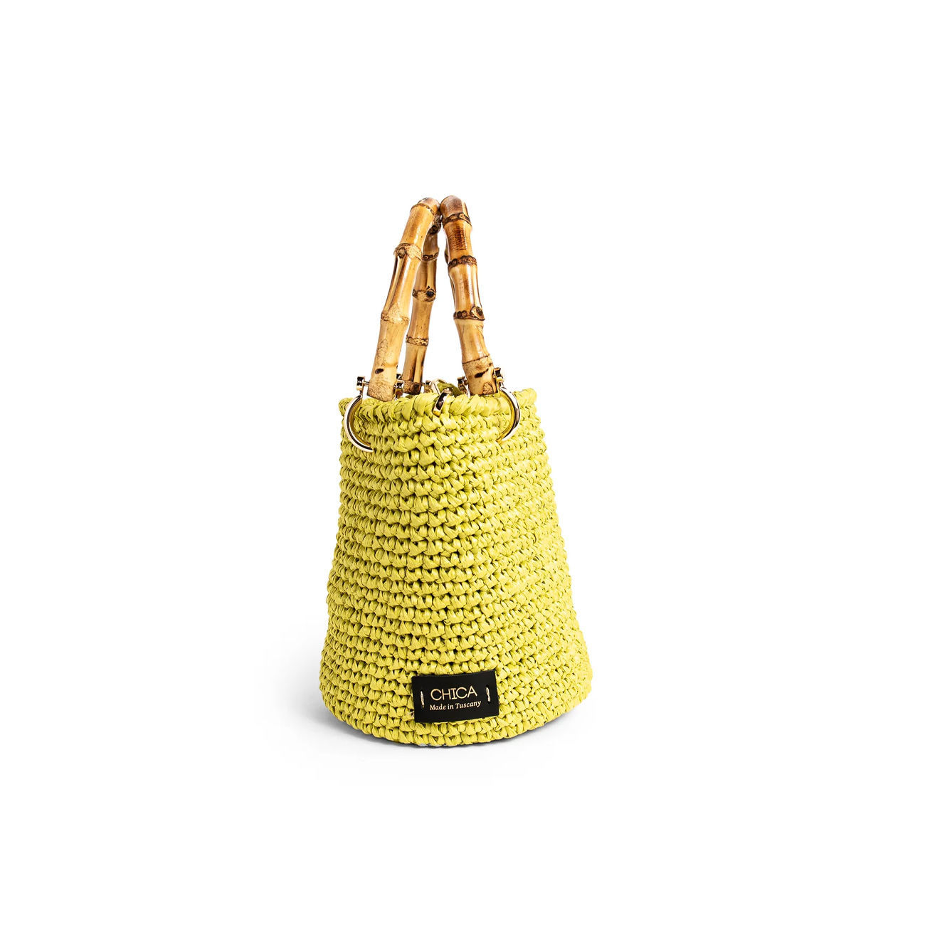 Bag made of raffia and worked by hand, has double bamboo handle. The inner clutch is removable and the closure is with zip. Side logo detail. Suitable to complete a refined outfit and to contain everything you need!