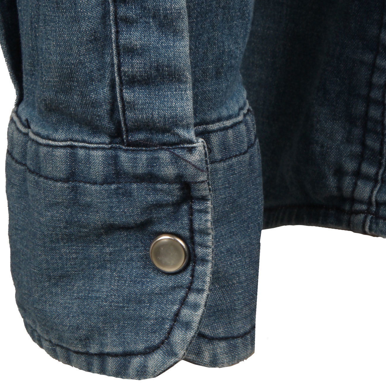 Western style denim shirt with classic collar, pearl button cuffs and closure with central row of pearl snap buttons