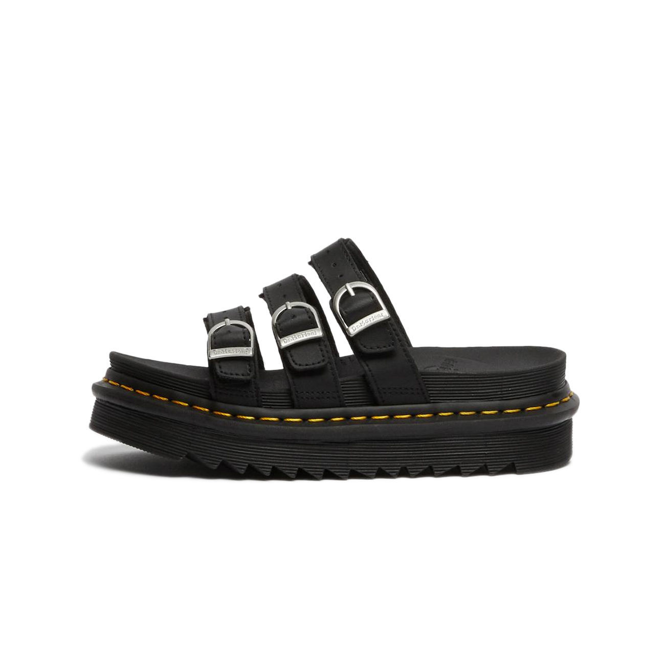 Blaire, the Docs interpretation of a practical slipper sandal. Featuring horseshoe buckles branded in a bold three-strap design. These sandals feature a lightweight EVA sole and are welded with Dr. Martens iconic yellow seams.