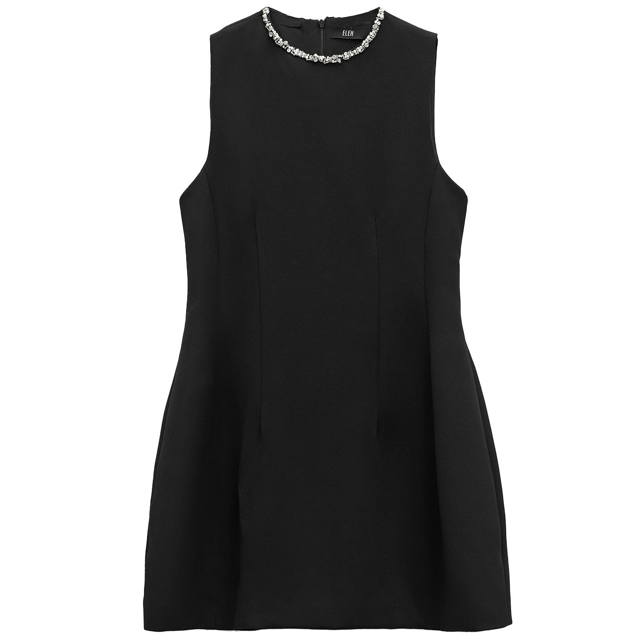 The Eleh mini dress interprets modern elegance with refined grace and effortless charm. The A-line silhouette and sleeveless cut define a clean silhouette, enhanced by the impeccably draped black fabric. The jeweled collar, embroidered with delicate, sparkling pearls, adds a touch of sophisticated splendor that captures the eye. Designed for special occasions, it evokes a harmonious balance between sartorial rigor and understated glamour. A piece that reflects Eleh's contemporary femininity and elegant aesthetic.