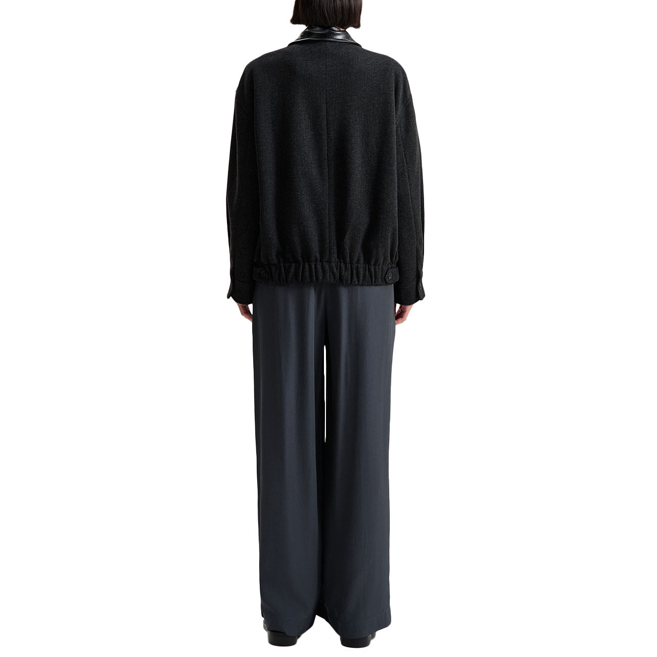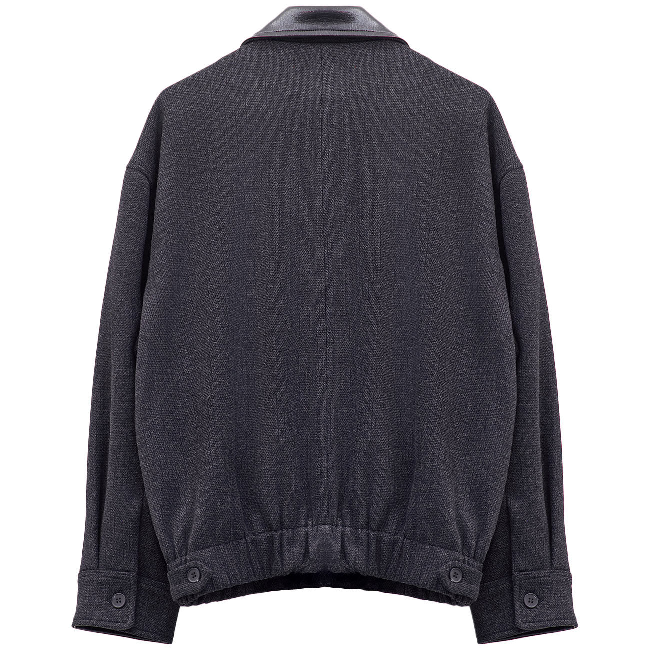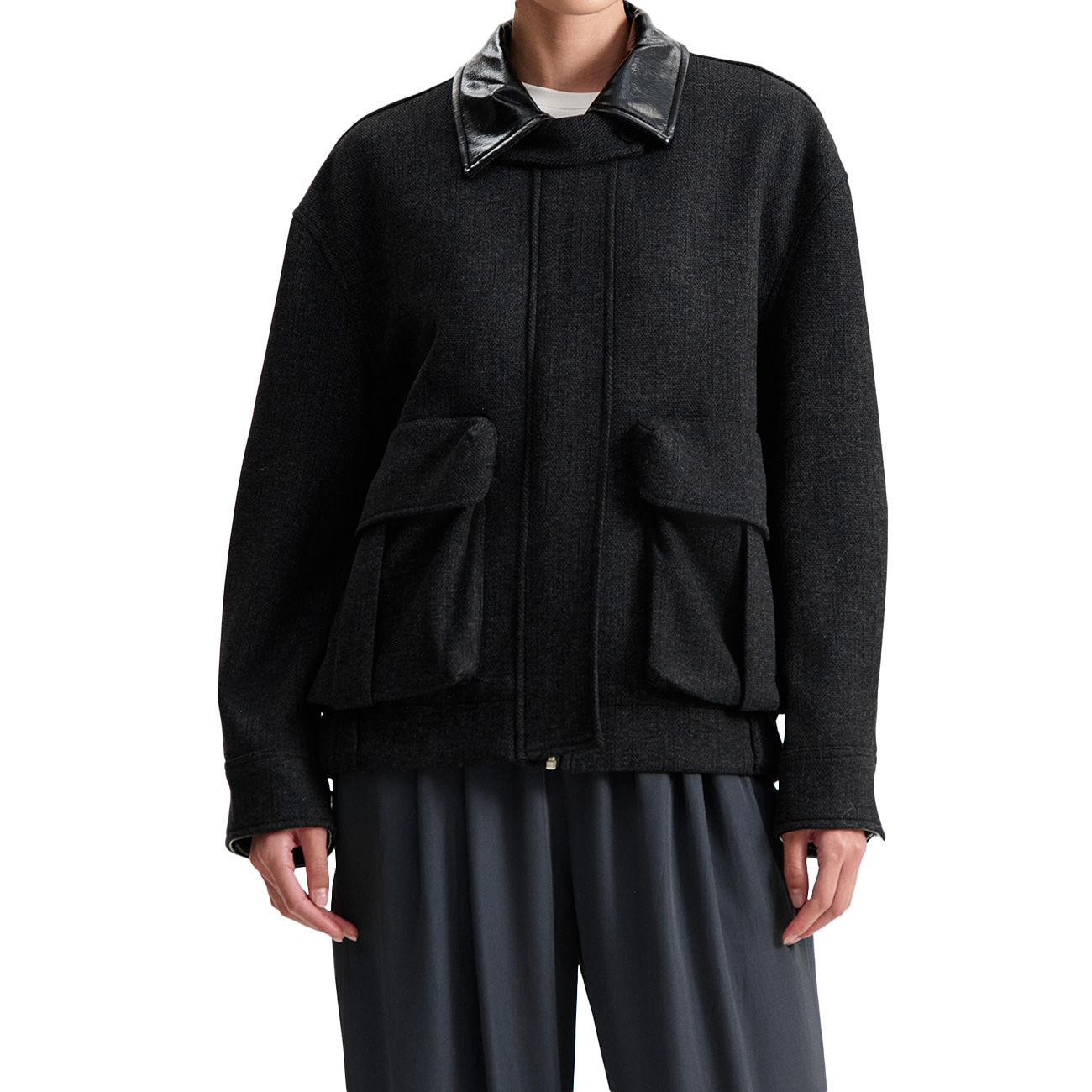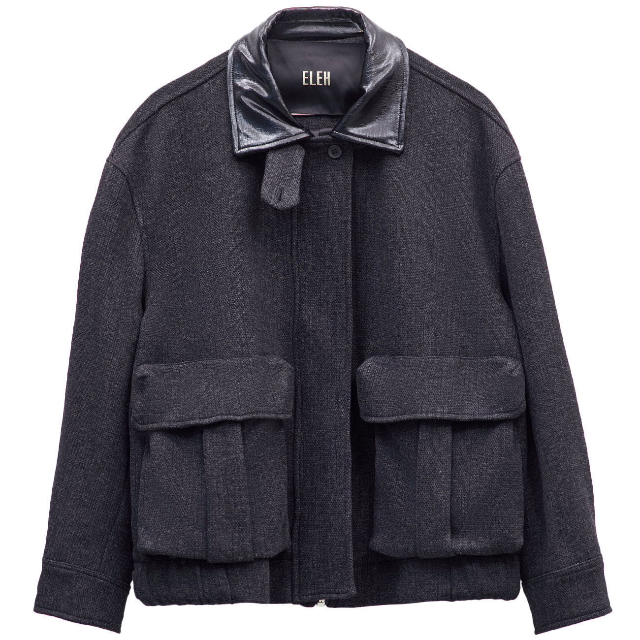 The Eleh Bomber Jacket redefines the classic outerwear piece with a luxurious interpretation and sophisticated design. Crafted from a textured black fabric, it features a sleek contrasting collar in shiny faux leather, adding an unexpected touch of boldness. The oversized silhouette and bellows pockets offer functionality and a striking aesthetic. This bomber jacket embodies the perfect blend of high-end streetwear and the contemporary elegance that is Eleh's hallmark.
