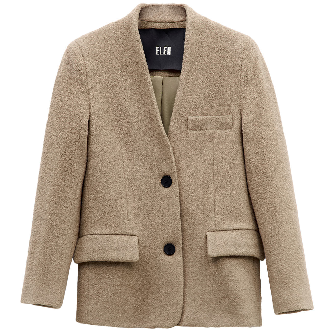 The Eleh Women's Cloth Blazer celebrates minimalist tailoring with refined elegance. Crafted from soft, textured camel cloth, the shawl collar enhances the clean, contemporary lines of the piece. The refined fit and contrasting buttons lend a casual, versatile elegance. Every detail reflects Eleh's impeccable quality and distinctive taste. An investment piece that effortlessly elevates any look, embodying luxury and timeless style.