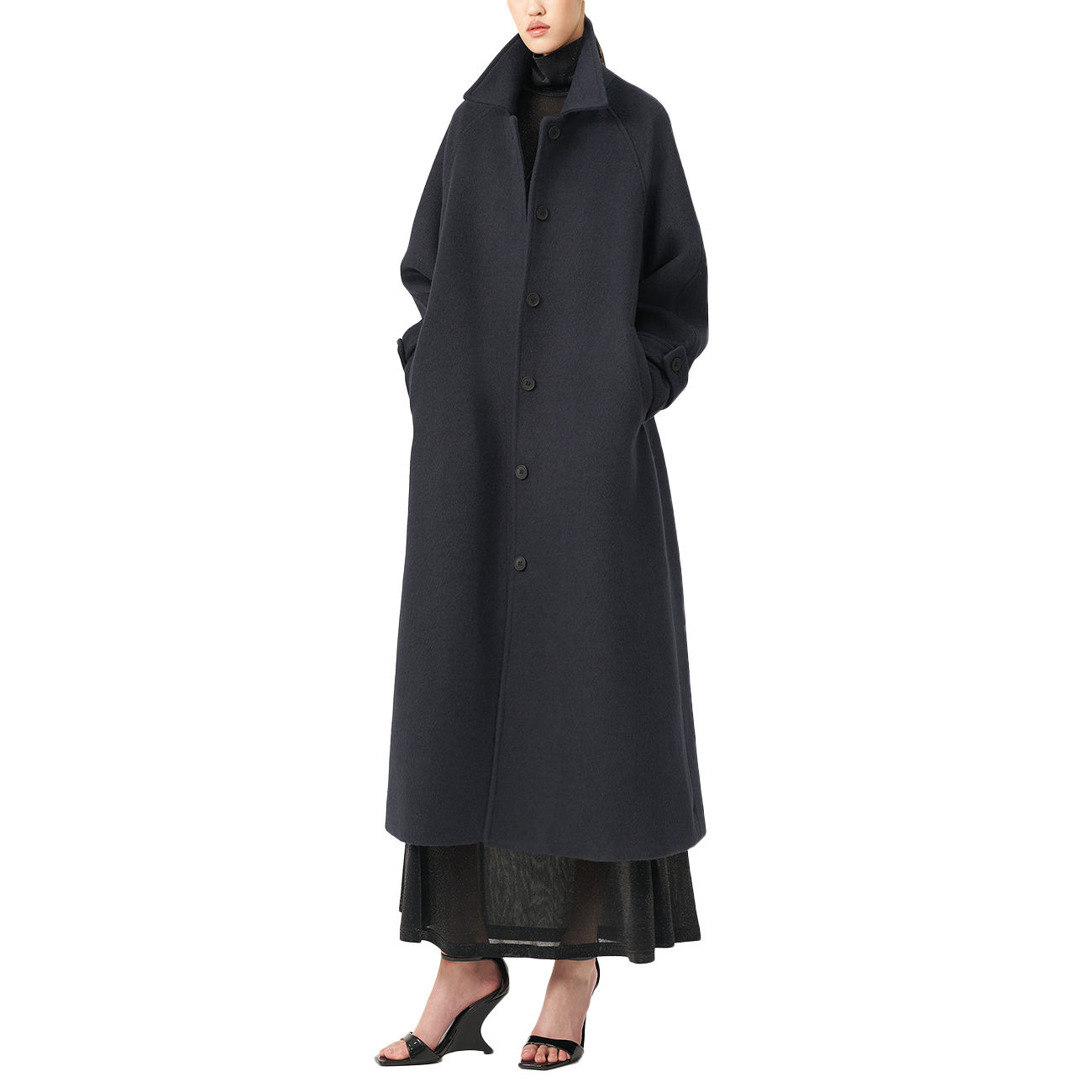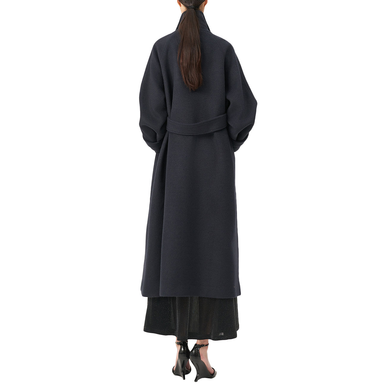 The Eleh Coat with Half-Belt represents the pinnacle of sartorial elegance. Crafted from a luxurious midnight blue fabric, it features a flowing maxi-length silhouette and a refined kimono cut. The back half-belt delicately defines the waist, adding a subtle yet distinctive detail. Every detail reflects Eleh's signature tailoring artistry and superior quality. A timeless piece, a symbol of sophisticated luxury and impeccable presence.