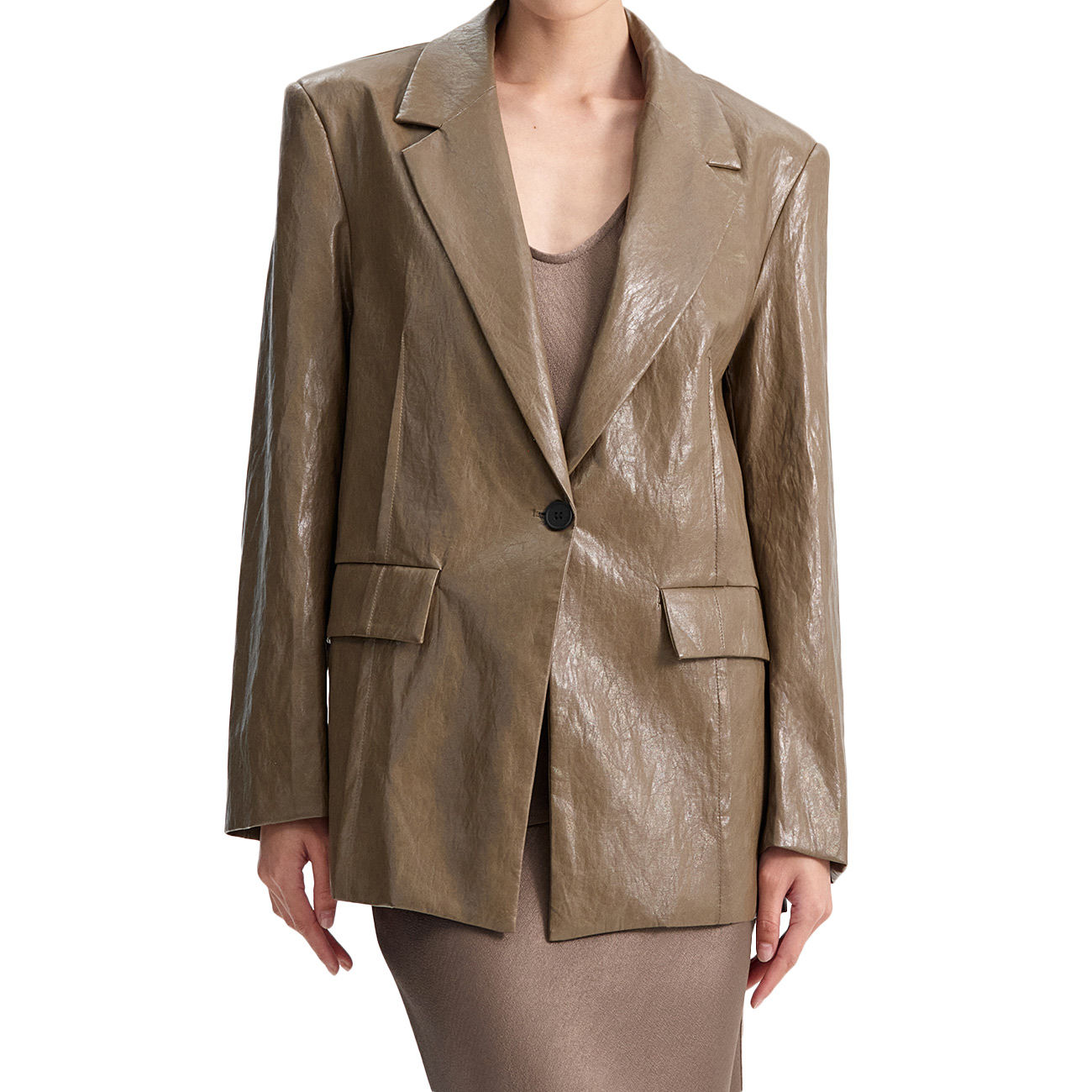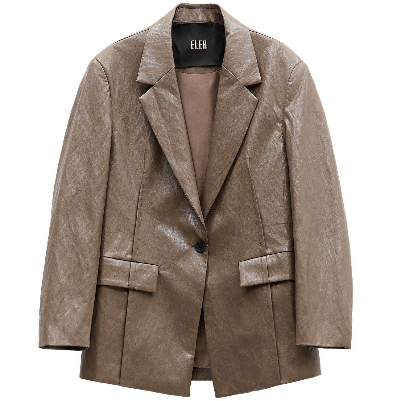 The Eleh Faux Leather Jacket is an icon of bold, contemporary style that reinvents modern tailoring. Crafted from rich faux leather with a slightly creased finish in a sophisticated khaki shade, it exudes character and sophistication. The structured silhouette, with defined shoulders and a single-button closure, conveys a bold, assertive elegance. A perfect blend of rock attitude and minimalist luxury, it enhances every look with effortless authority. An investment piece that instantly elevates any Eleh wardrobe.