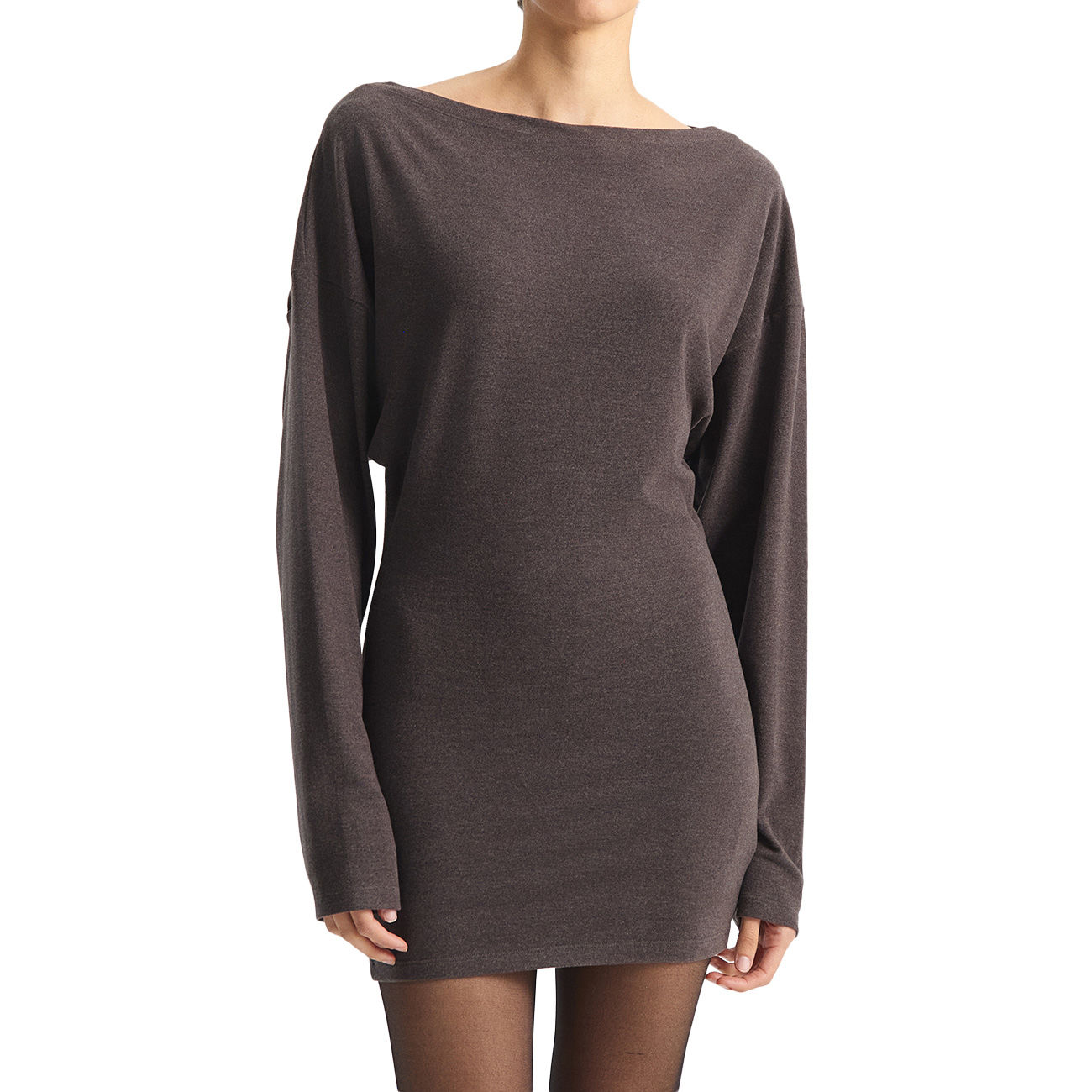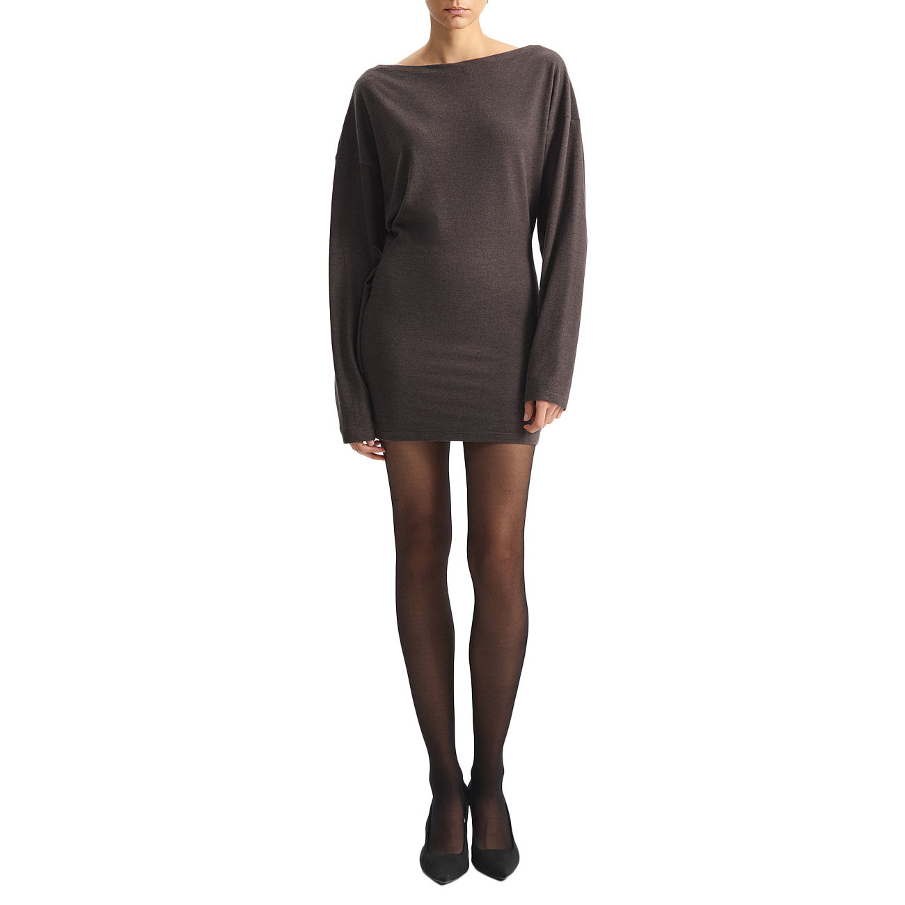 The Eleh Jersey Knit Dress is the epitome of minimalist luxury and refined versatility. Crafted from ultra-soft jersey in a sophisticated charcoal brown hue, it delicately hugs the figure. The oversized cut of the top blends seamlessly with the tapered skirt, creating a perfect balance. The boat neckline adds a touch of understated, contemporary elegance. This piece embodies Eleh's relaxed sophistication and distinctive aesthetic.