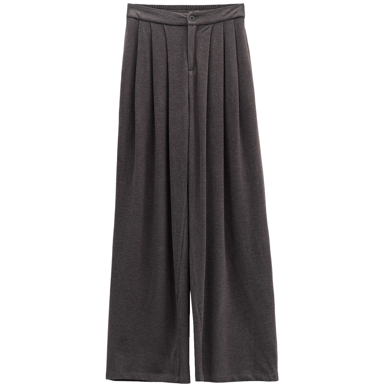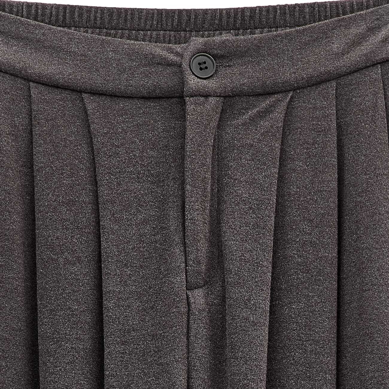 These jersey pants are a celebration of tailoring that prioritizes comfort without sacrificing high fashion. The wide-leg fit and soft front pleats create a fluid, theatrical silhouette that elegantly elongates the figure. The high-quality jersey fabric, with a charcoal melange texture, provides a luxurious drape and unparalleled versatility. While echoing the tailored cut, the elastic waistband ensures an effortless fit. A key piece that perfectly balances luxury and practicality, ideal for a sophisticated daytime look or chic evenings.