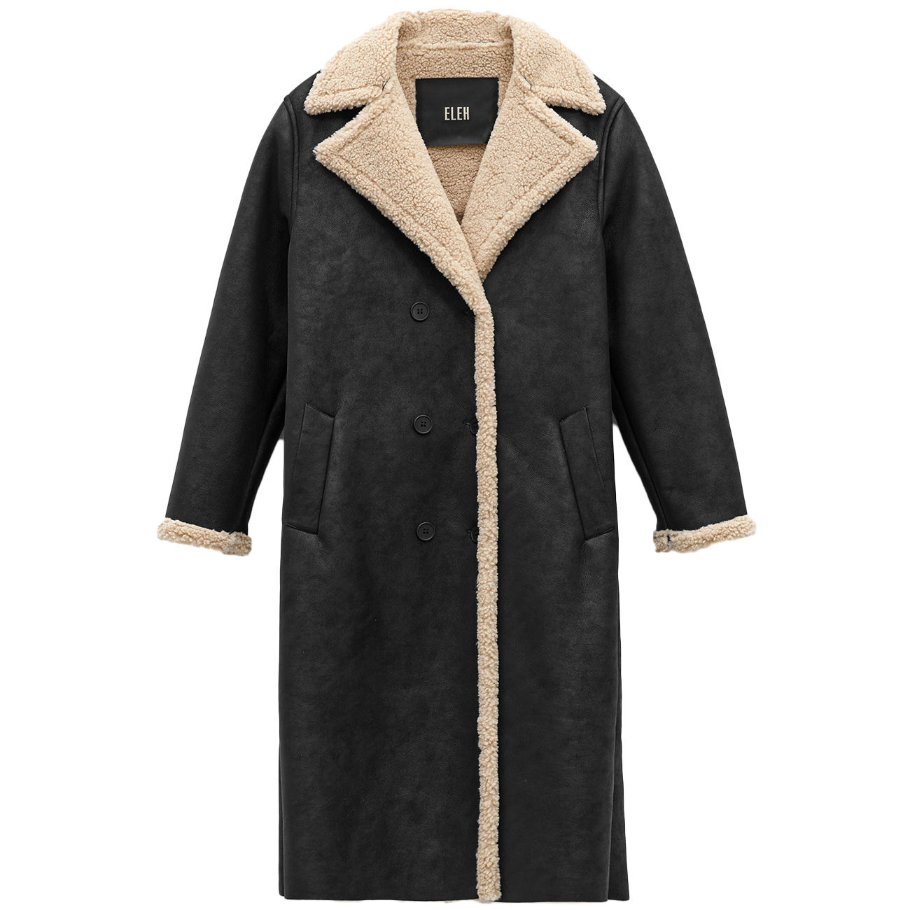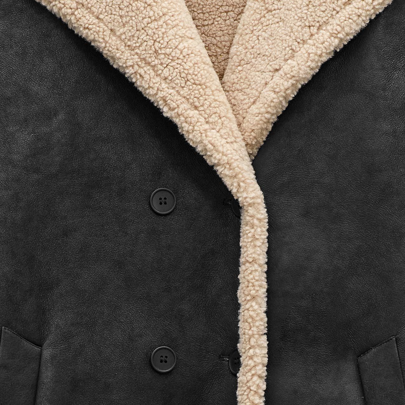 The Eleh long sheepskin coat embodies winter luxury with a striking, modern silhouette. Matte black suede elegantly hugs the figure, while exposed camel shearling on the collar, edges, and cuffs creates a refined visual contrast. The maxi fit and double-breasted design ensure uncompromising warmth and comfort. Every detail enhances its sophisticated and distinctive presence, transforming the garment into a true statement. Perfect for a winter filled with bold style and protection.
