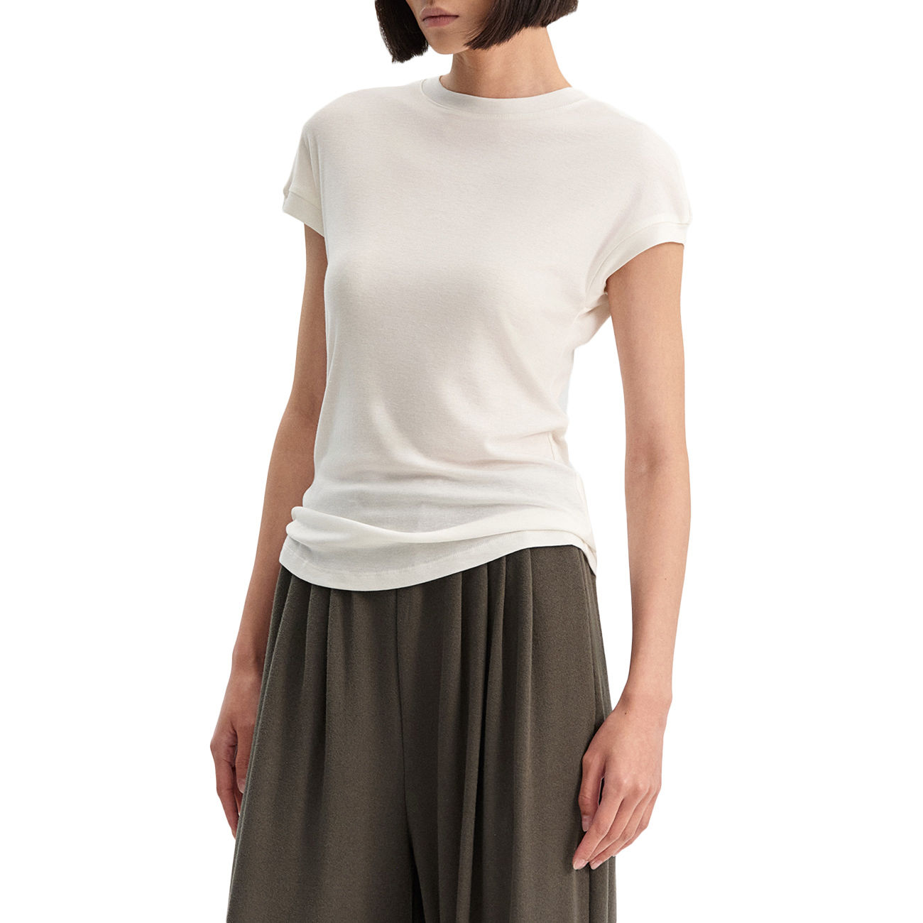 A celebration of simplicity, the basic t-shirt is the foundation of a luxury wardrobe. Crafted from silky cotton jersey, it hugs the figure with an impalpable texture and a slim yet comfortable fit. The round neck and short sleeves with finished, almost hood-like cuffs lend a refined, understated elegance. Perfect as a refined undercoat or worn alone, it demonstrates that true sophistication lies in the purity of lines. A versatile and timeless go-to, elevated by the quality of the materials.