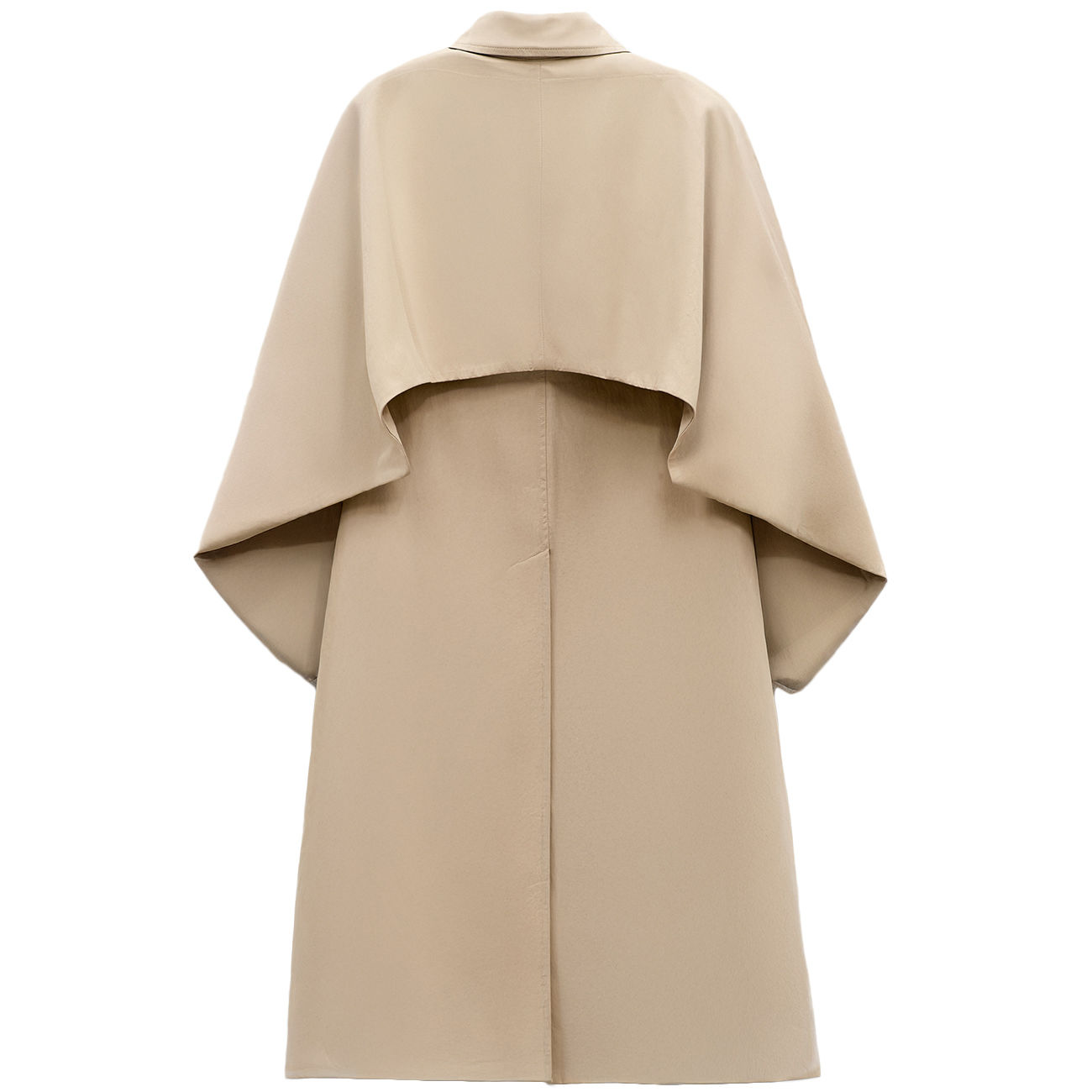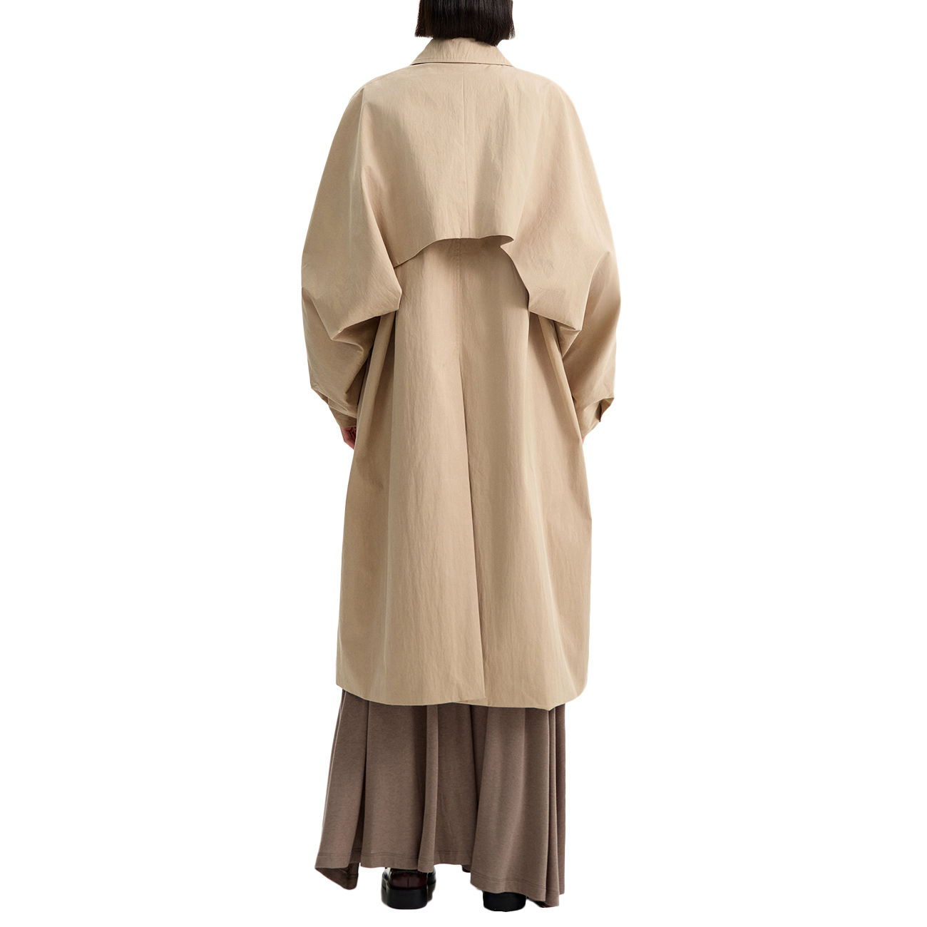 The Eleh trench coat in refined camel beige reinterprets the classic icon with modern, flowing volumes. The wide kimono sleeves and oversized fit cascade with effortless elegance, while the bold back cape and lapel collar lend a distinctive sartorial touch. The lightweight, impeccable fabric enhances the garment's quality, ensuring comfort and movement. Every detail celebrates discreet, sophisticated luxury, perfect for contemporary layering. This outerwear piece is designed for the woman who desires a striking silhouette and refined elegance.