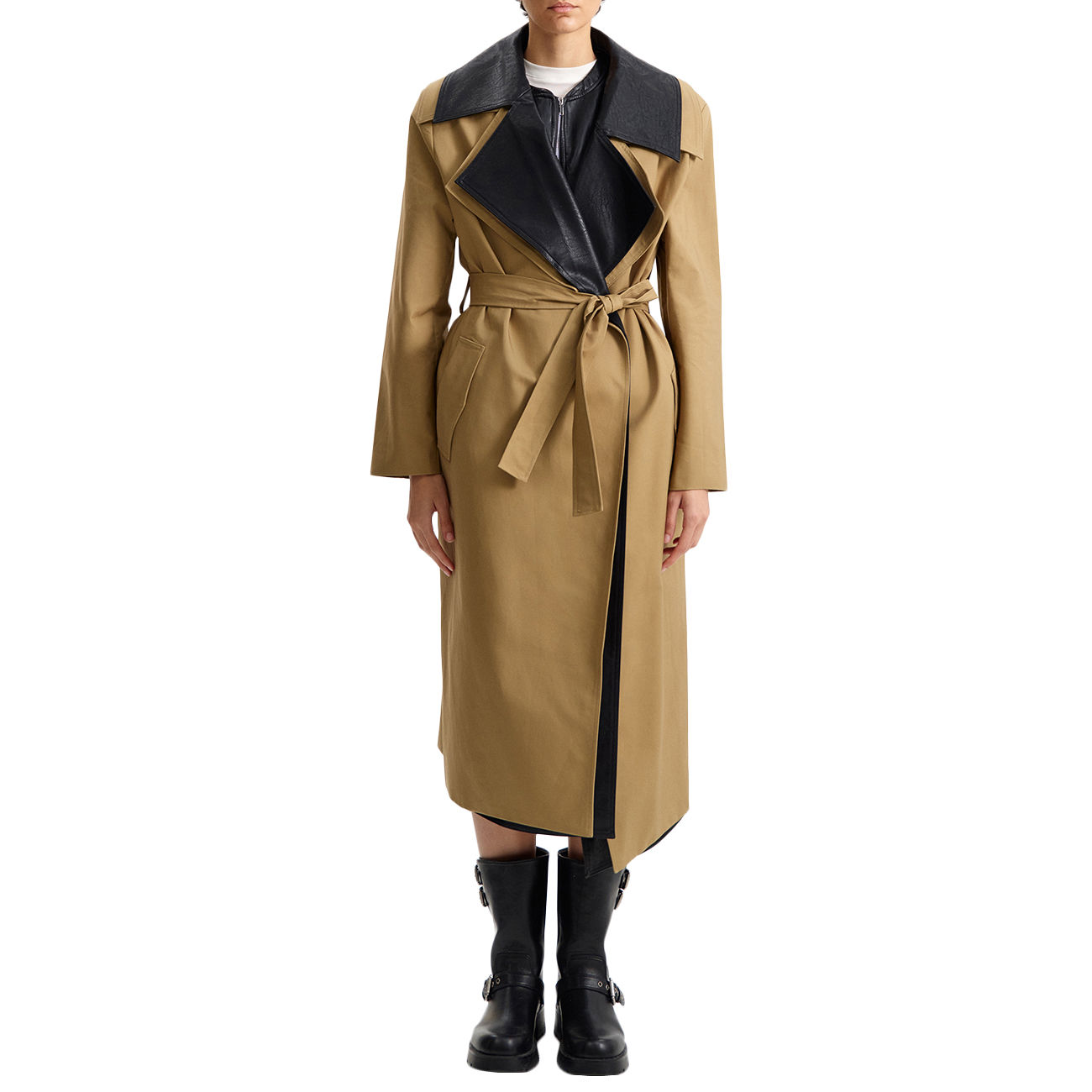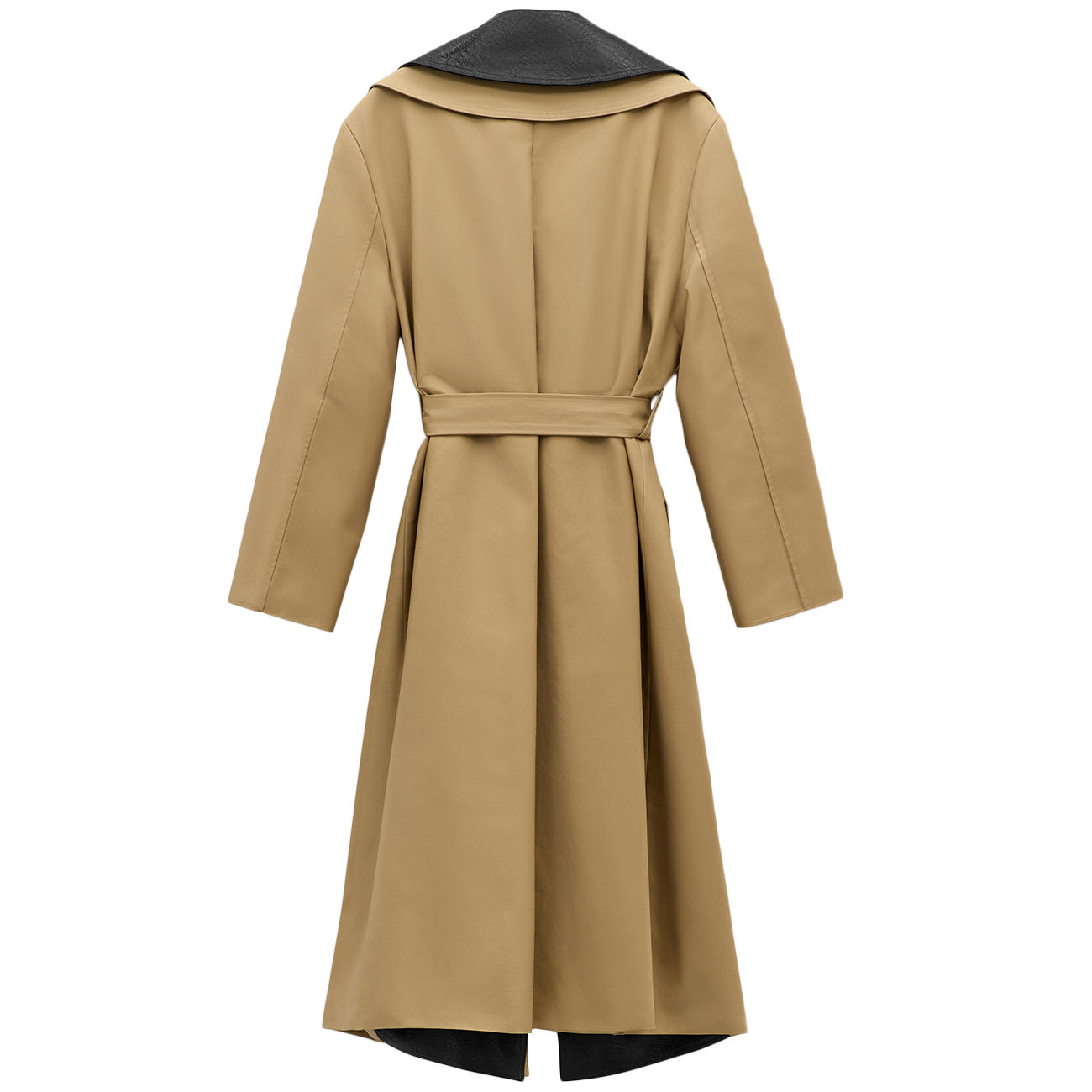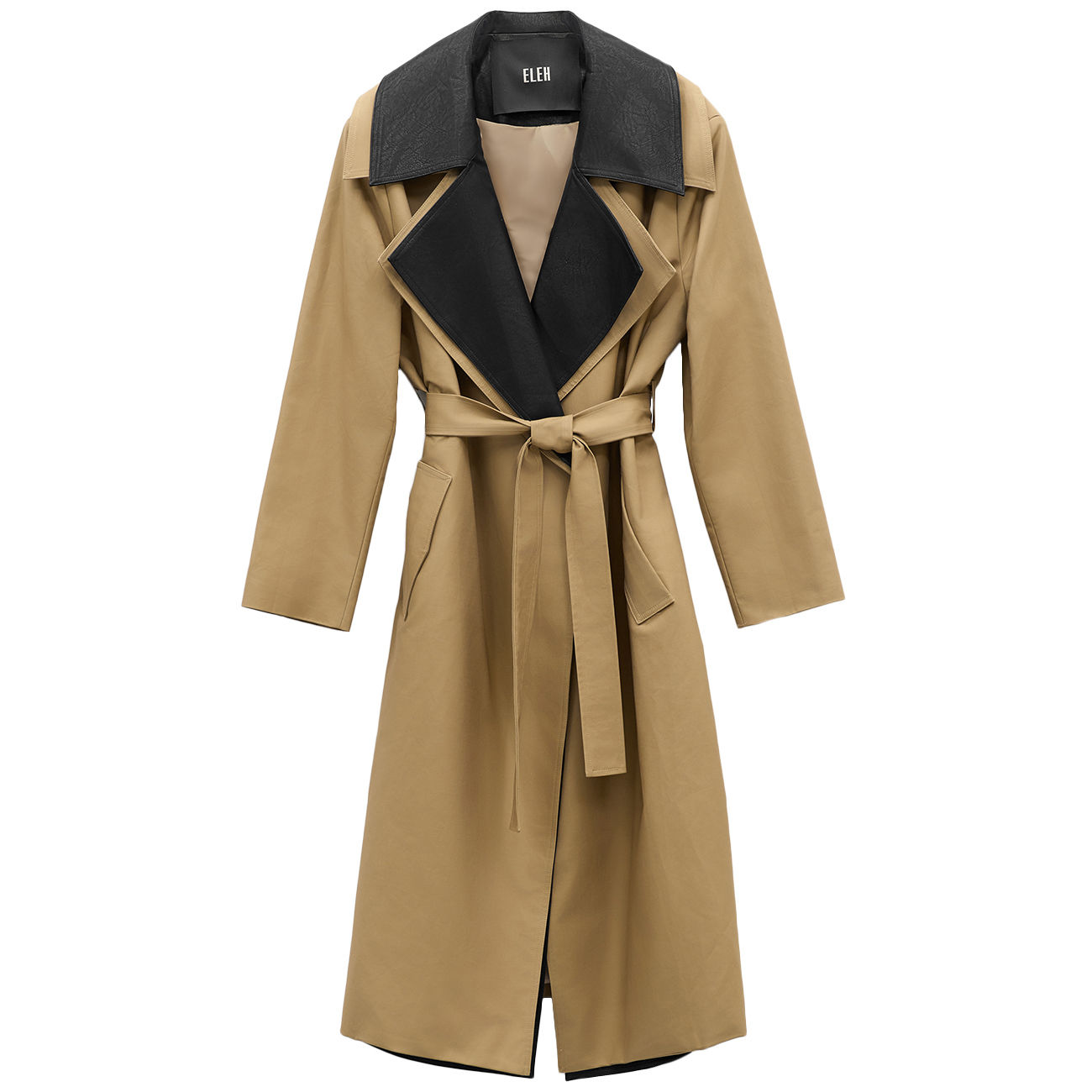 The Eleh Trench Coat with Trim celebrates contemporary tailoring with timeless elegance. The camel hue, enhanced by the contrasting collar and dark trim, gives the piece a bold and sophisticated character. The long, flowing silhouette, defined by the belted waist, accompanies movement with natural grace. Every detail reflects Eleh's signature art of cut and proportion. A reinterpreted classic, a symbol of modern luxury and conscious femininity.