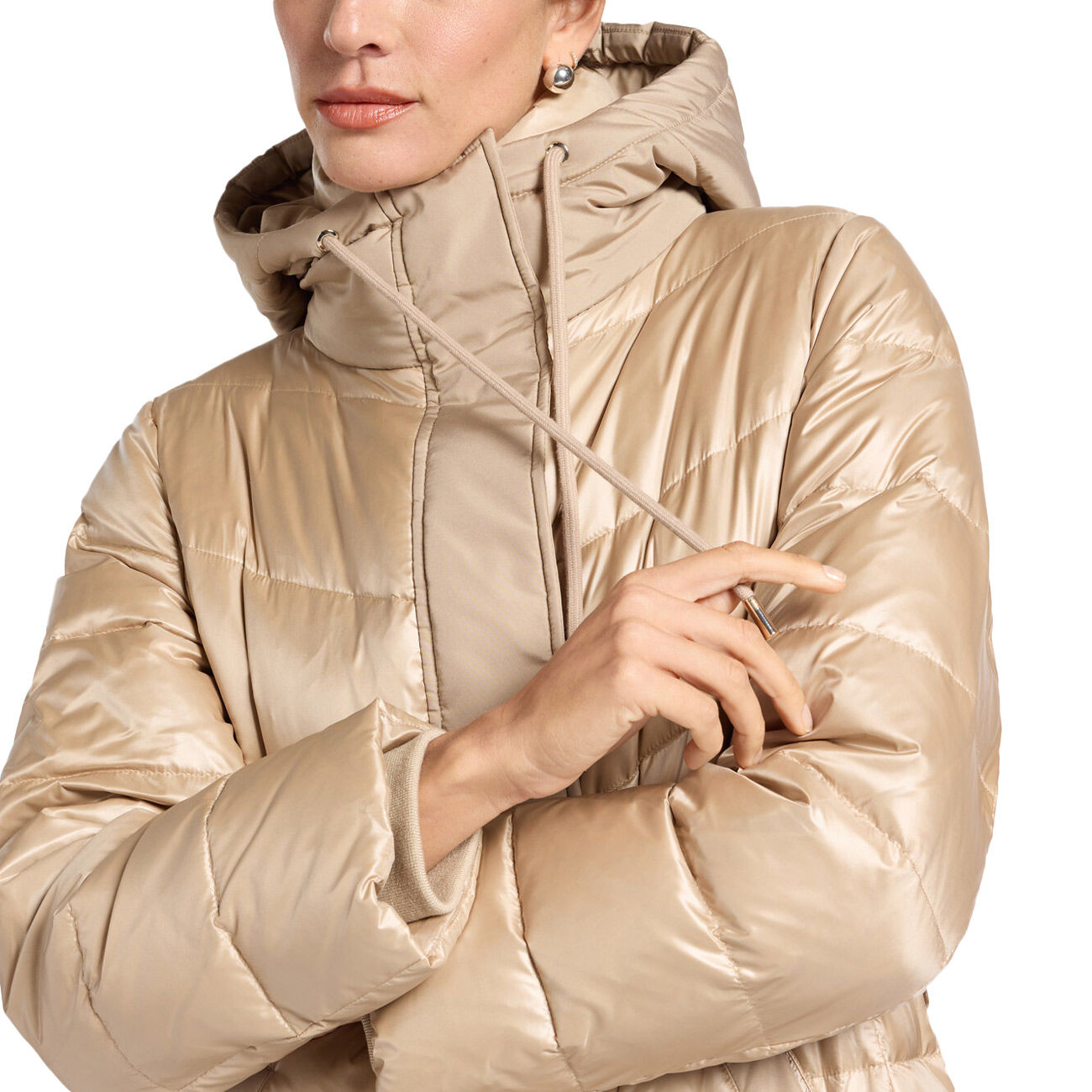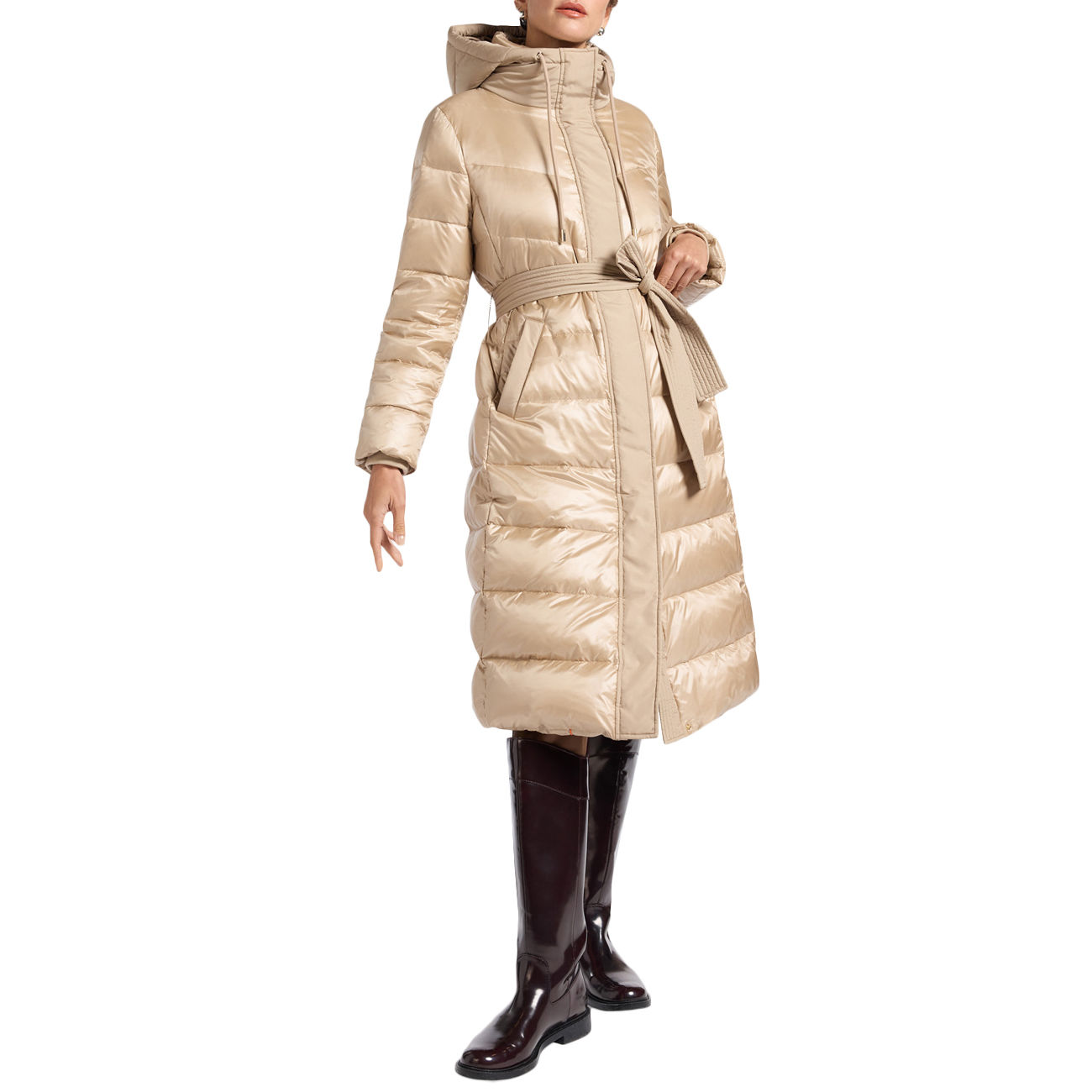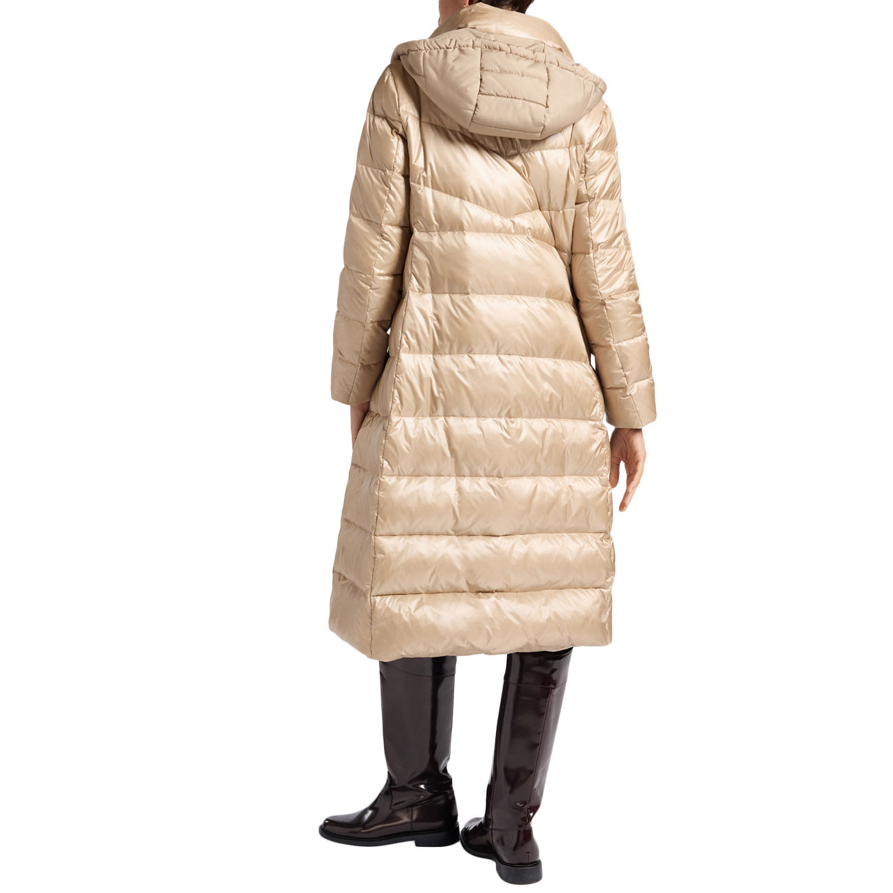 Elegant and contemporary, this long down jacket by Elena Mirò captivates with its refined contrasts between shiny nylon and matte nylon details on the hood, flap, and belt. The fitted and slightly flared silhouette flatters the figure, while the removable belt harmoniously defines the waist. The drawstring hood adds a functional and sophisticated touch. Inside, the shiny lining and real down padding ensure warmth and lightness. The pockets with logoed snaps complete this impeccably feminine piece.