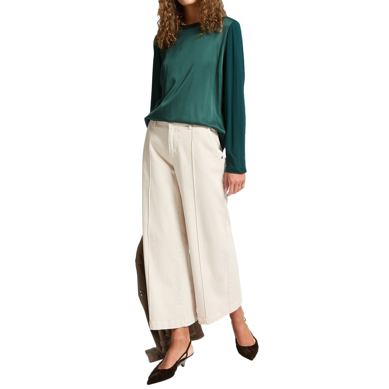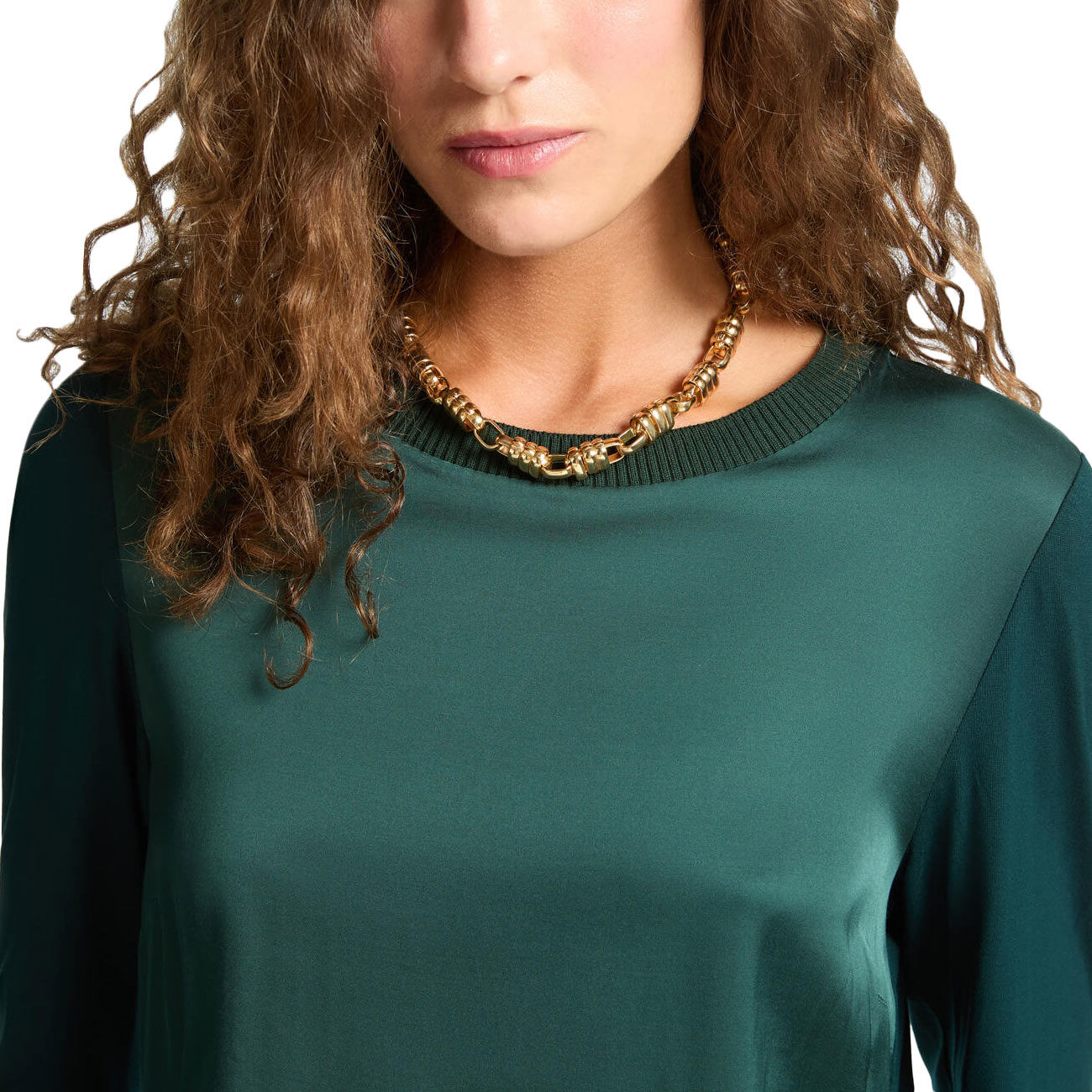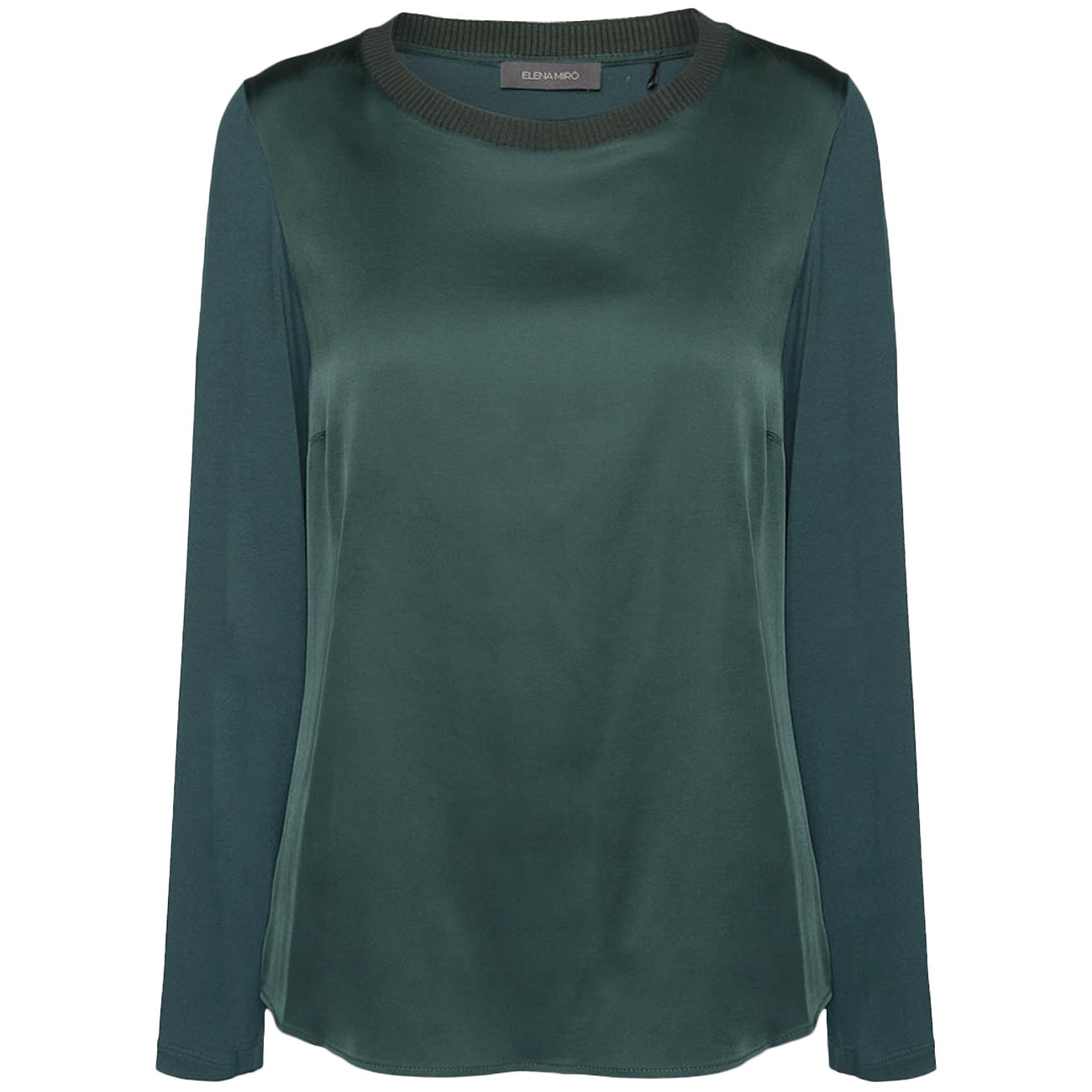 Discover the timeless elegance of the Elena Mirò T-shirt, where the shiny satin front meets the soft jersey sleeves and back, creating a refined contrast of textures. This basic style, reinterpreted with meticulous tailoring, enhances the fit and adds a sophisticated allure to every look. The round neckline, embellished with a delicate elastic trim, ensures comfort and style for every occasion. Perfect worn alone or under a jacket, this T-shirt adapts effortlessly to any season. The combination of materials and design makes it a versatile piece, ideal for those seeking uncompromising sophistication.