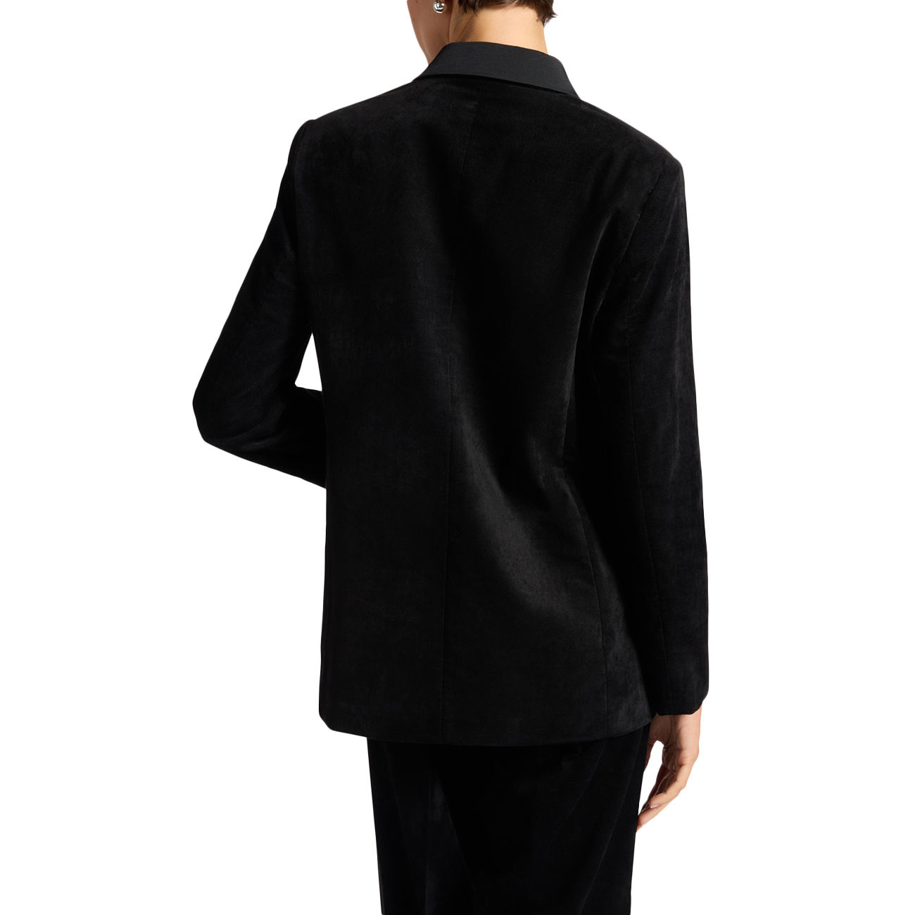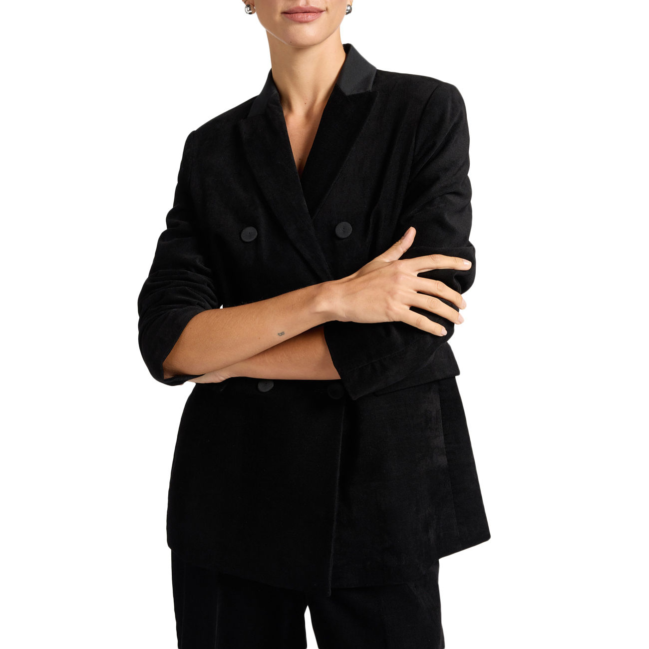 Refined and sensual, this Elena Mirò tuxedo blazer reinterprets a classic women's wardrobe with contemporary allure. Crafted from luxurious cotton and stretch viscose velvet, it envelops the figure with softness and luminosity. The peak lapels emphasize the elegance of the piece, while the double-breasted closure and fitted silhouette enhance femininity with balance and decisiveness. Carefully lined, this iconic piece is ideal for adding a touch of sophisticated seduction to any special occasion.