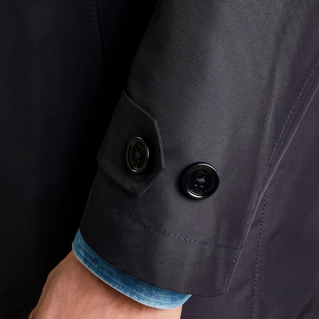 The Morning Coat is an iconic raincoat with a double front construction for a casual and timeless elegance. This unlined version is made of technical poplin with water repellent finish. It features banded and buttoned welt pockets and cuffs with zip and button closure. An internal pocket completes the garment.
