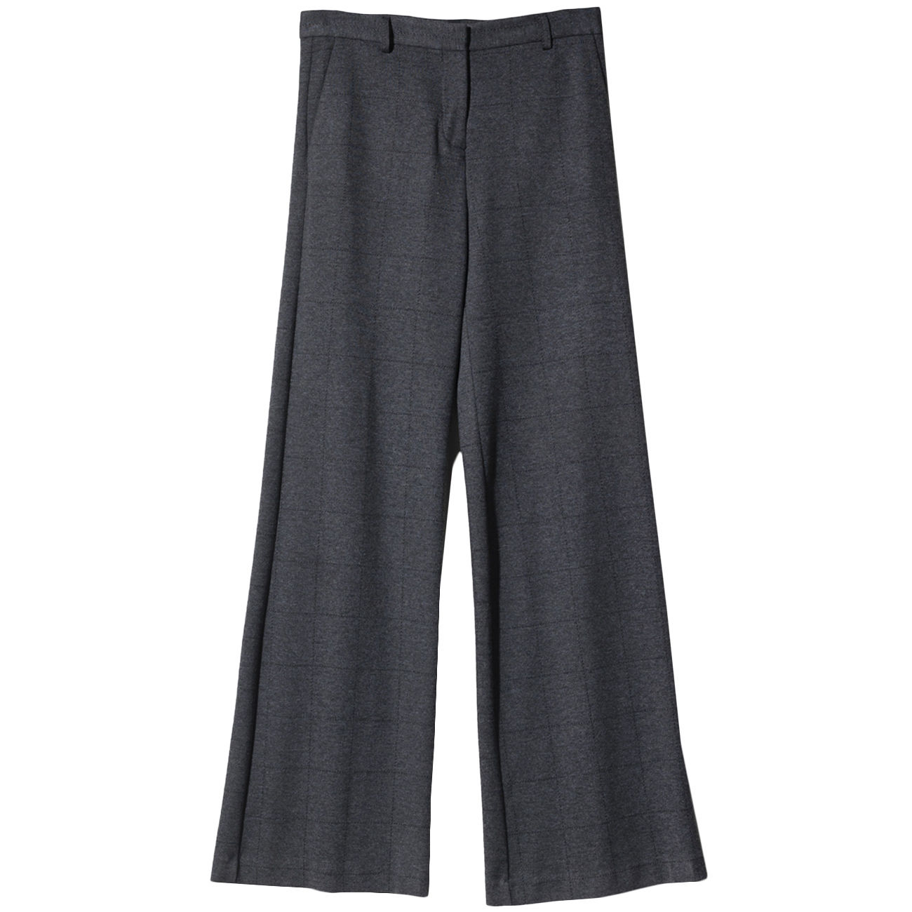 Perfect for those who love refined style without sacrificing comfort, these elegant dark gray palazzo pants captivate with their fluid and impeccable fit. The wide-leg silhouette flatters the figure with effortless elegance, while the high-quality fabric with tone-on-tone micro-checks adds a touch of understated sophistication. Versatile and sophisticated, they pair easily with structured blazers or silk blouses, creating looks with contemporary appeal. Ideal for the office or an evening out, they perfectly embody the spirit of effortlessly chic.