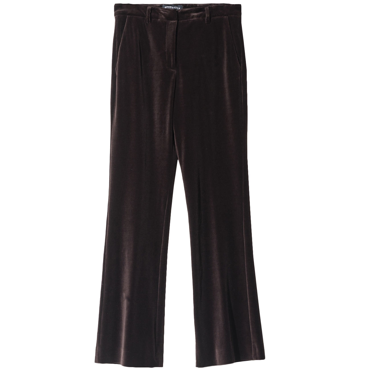 These regular-fit pants reinterpret evening elegance with a refined touch of opulence. Crafted from deep chocolate brown velvet, they seduce with their luminous texture and soft feel. The straight cut, slightly flared at the ankle, creates a sleek and sophisticated silhouette. The clean waist and invisible pockets enhance the minimalist design that lets the precious fabric shine. Perfect for understated evening outfits or for adding a luxurious twist to everyday looks.
