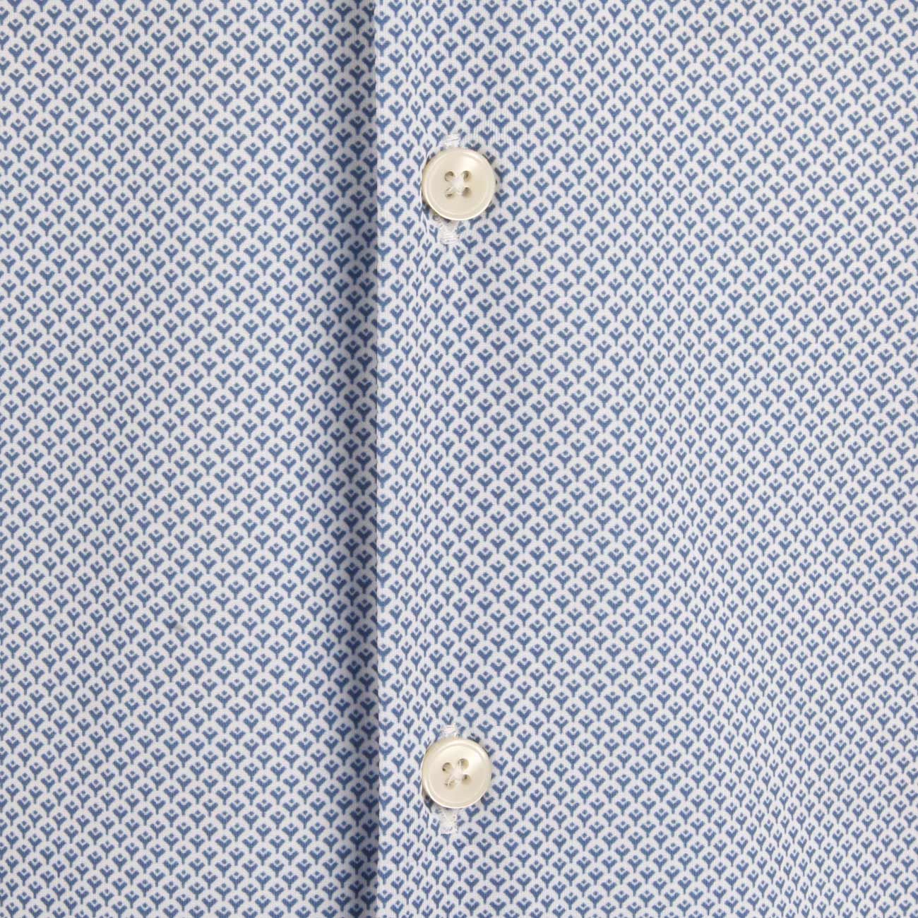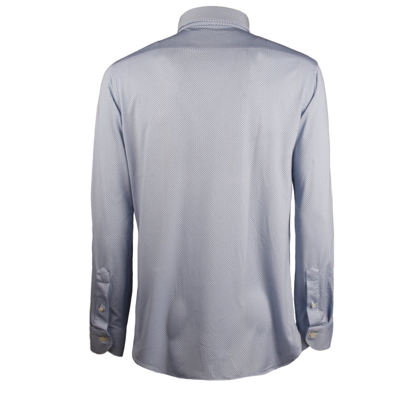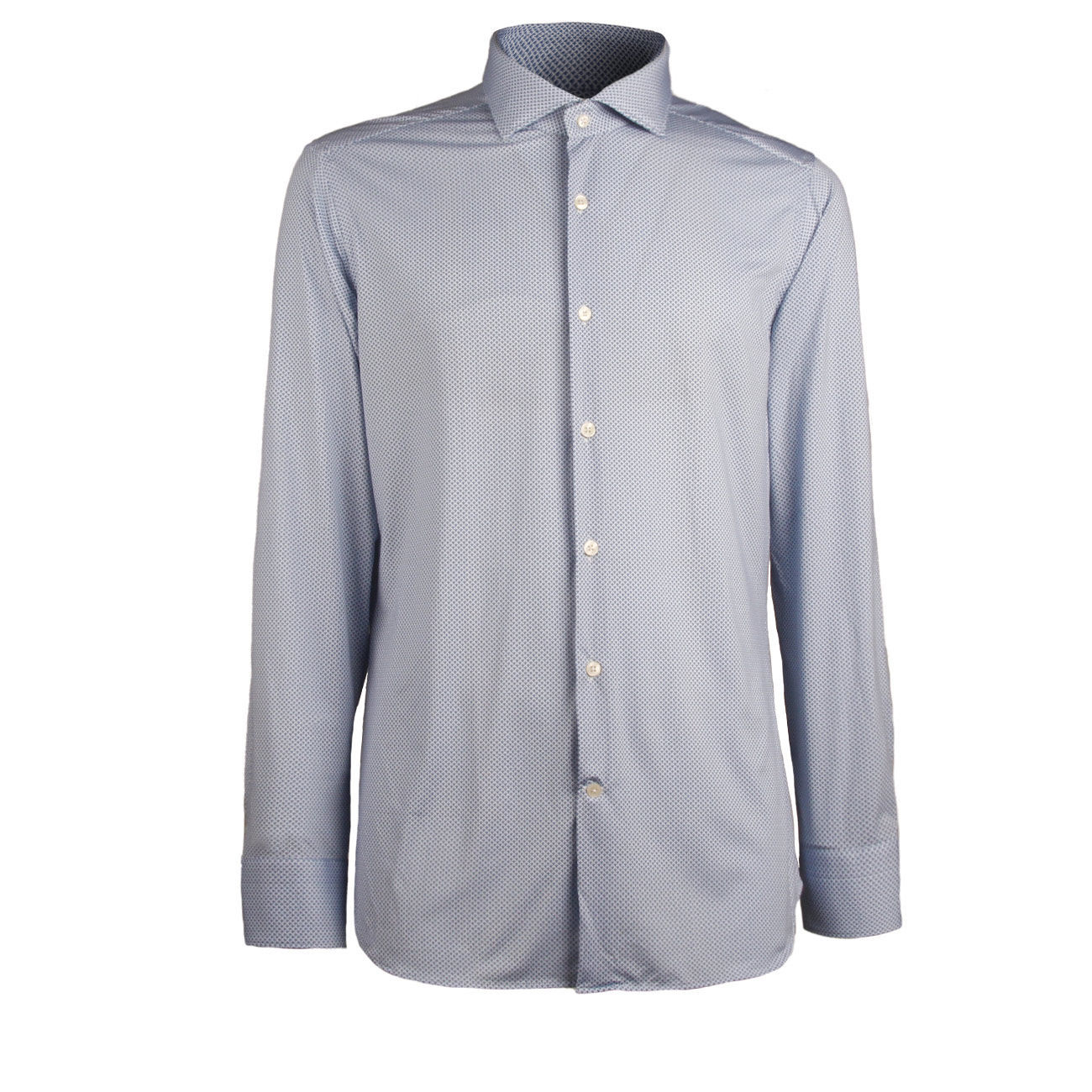 Shirt signed guglielminotti made with a pattern in white and blue. This straight-cut shirt features the classic buttoned cuffs, a French collar, side slits and a central closure with a row of exposed buttons.
