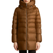 Chic and feminine down jacket with feather padding made of innovative technical fabric, has a cozy line and refined shades. Features three-quarter sleeves, welt pockets and blanket closure with snap buttons