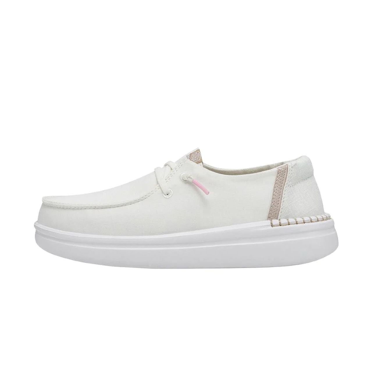 The iconic Wendy moccasin is renewed in a new, higher and more comfortable version. The Wendy Rise collection is even lighter and more comfortable. Features a soft canvas blend upper, ultralight sole and elastic laces. An elegant contrast texture and hand-sewn details on the heel complete the look.