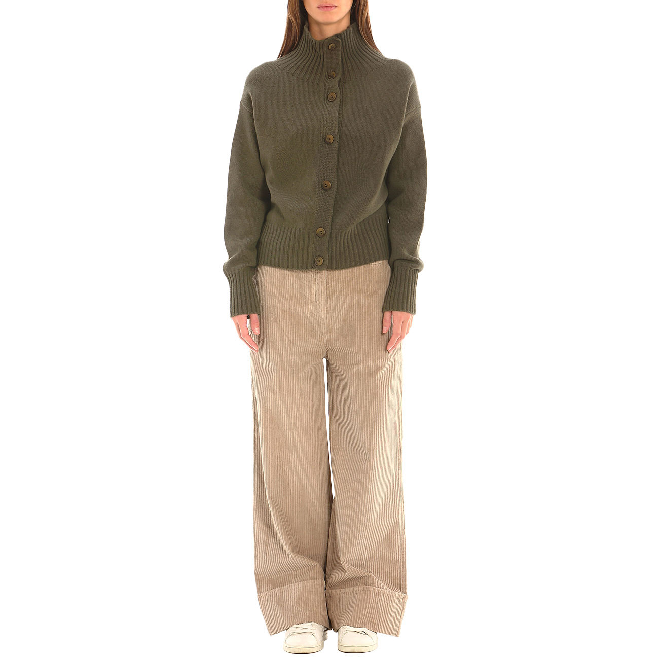 Refined and casual, the Homeward Cardigan elevates knitwear to a symbol of relaxed elegance. The soft, enveloping knit in sophisticated military green combines comfort with contemporary style. The ribbed high neck and button closure create a clean yet assertive silhouette. Perfect as a transitional outerwear piece or as a distinctive element of an urban look. A versatile piece that expresses the natural luxury of modern style.