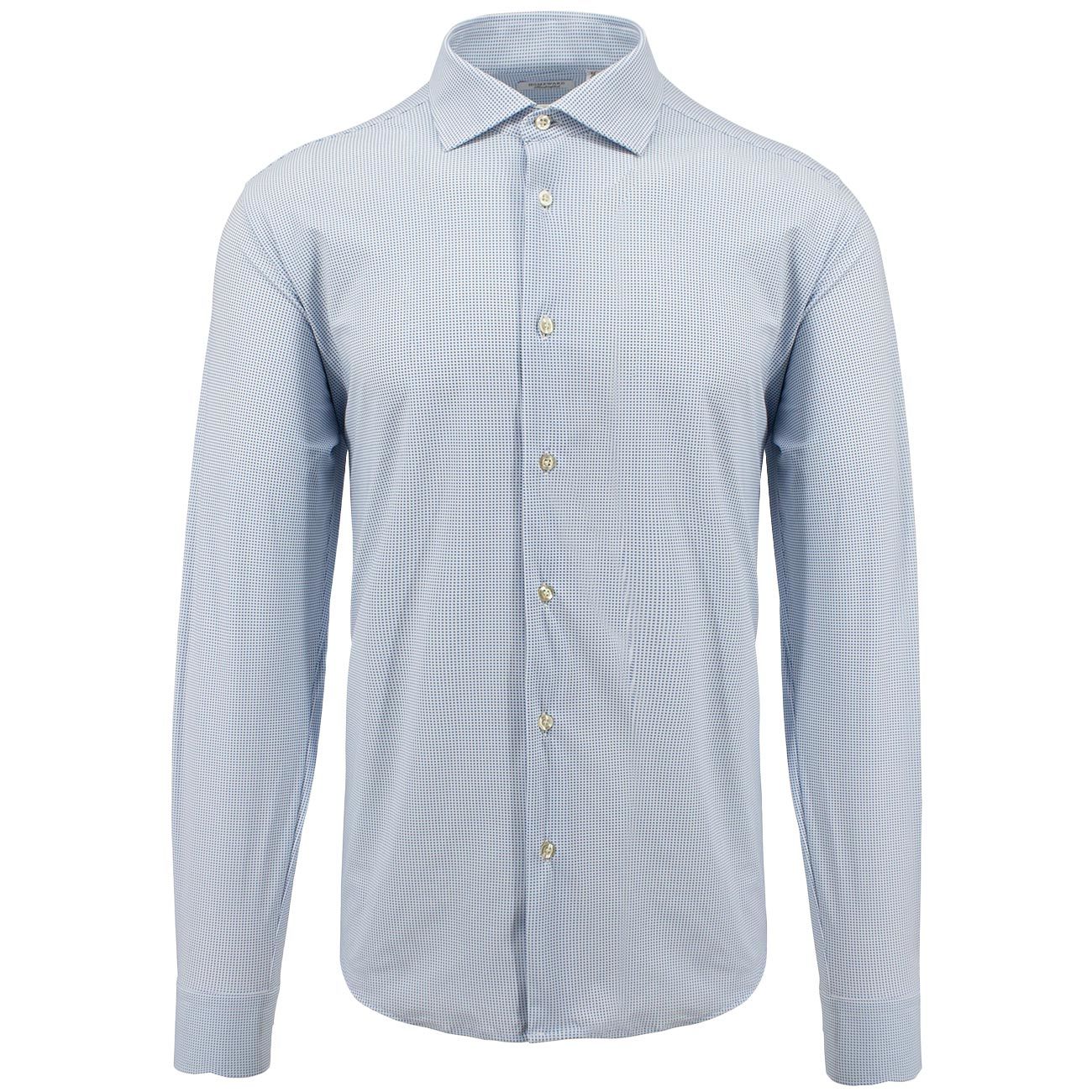 A perfect blend of performance and tailoring, the Homeward Shirt elevates the formal wardrobe with a touch of modernity. The technical nylon fabric offers an impalpable lightness and impeccable drape, ideal for the dynamic man who doesn't compromise on elegance. The light blue micro-pattern adds depth and discreet dynamism, while the classic collar ensures impeccable allure. This piece is the quintessential contemporary dress code.