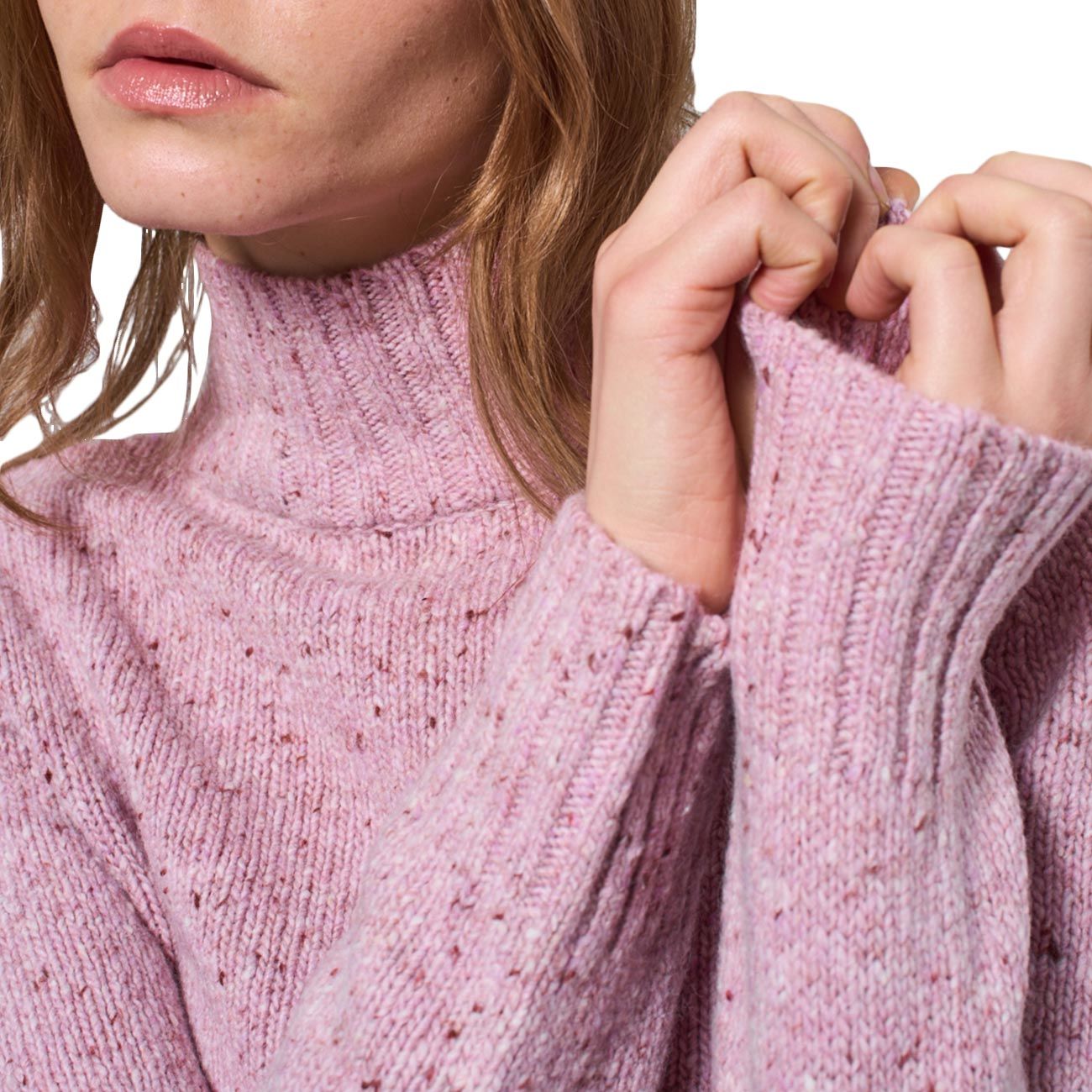 Enveloping and refined, this turtleneck by Maida Mila is the ideal companion for facing the coldest season in style. Crafted from a luxurious tweed, it interweaves fine colored threads on a pastel pink base, creating a rich and luxurious texture. The elegantly structured high neck gracefully frames the face and lends a contemporary allure. The soft, boxy fit ensures a balance between comfort and sophistication. A garment that combines warmth, personality, and impeccable taste.