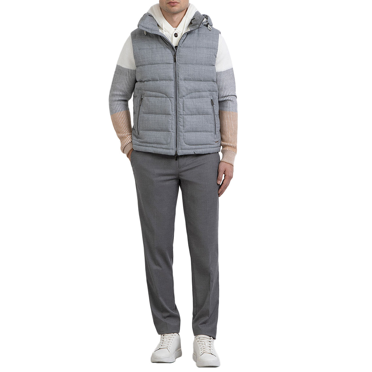 This sleeveless jacket blends functionality and contemporary style with understated elegance. The adjustable and detachable hood offers versatility, while the front closure and side zip pockets combine practicality and technical details. The clean silhouette enhances the urban profile, lending a refined and modern look. The choice of materials and meticulous finishes enhance the premium and distinctive design. An essential piece for the metropolitan man seeking comfort, style, and adaptability for every occasion.