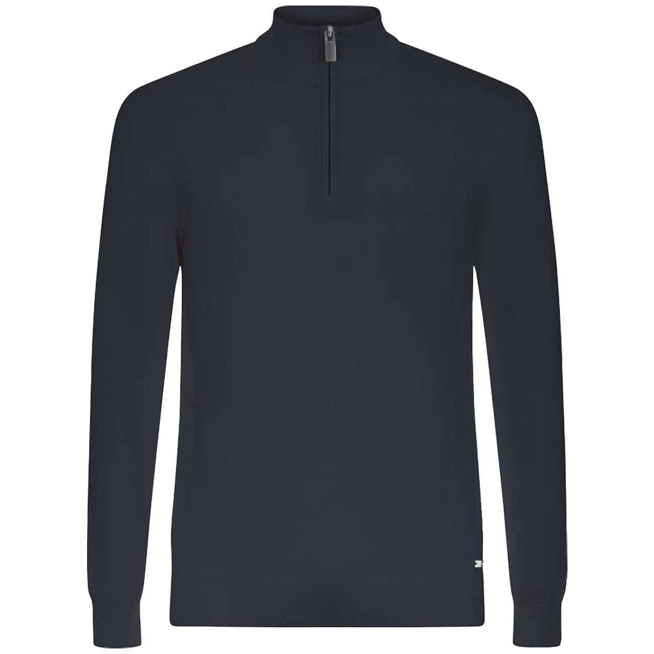 The Markup Zip-Up Sweater embodies the essence of elegant versatility, presented in a deep navy blue that emphasizes its understated elegance. Crafted from a premium viscose blend, it ensures a fluid fit and a soft touch against the skin, ideal for long-lasting comfort. The high zip-up neck adds a functional element and a modern detail, allowing for easy adjustments.
