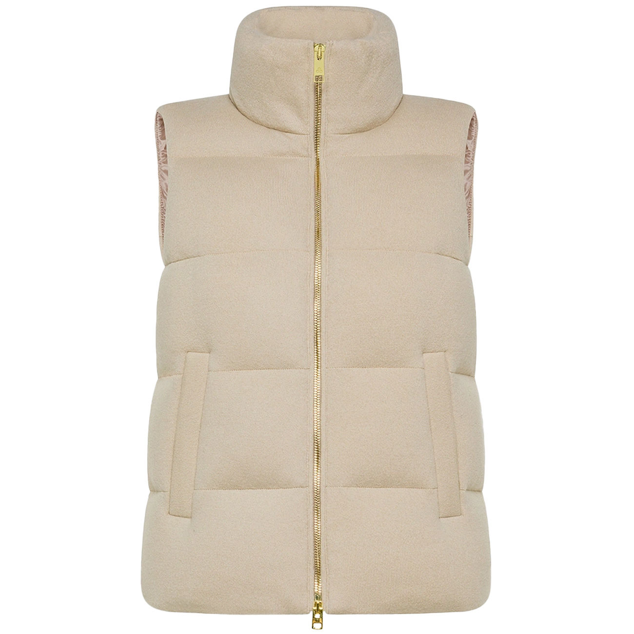 Made of pure combed wool stretch jersey, this padded vest with large quilting combines elegance and comfort in a simple and sophisticated design. The soft and luxurious texture of the fabric enhances the garment's refinement, making it an ideal choice for a refined yet casual style. Part of the Nuvola line, it is designed to envelop you lightly, like a warm and delicate embrace. The natural down filling ensures impalpable warmth and a comfortable fit. The full gold center zip and welt pockets add a touch of brightness and functionality. Short and versatile, it interprets everyday elegance with a modern twist.