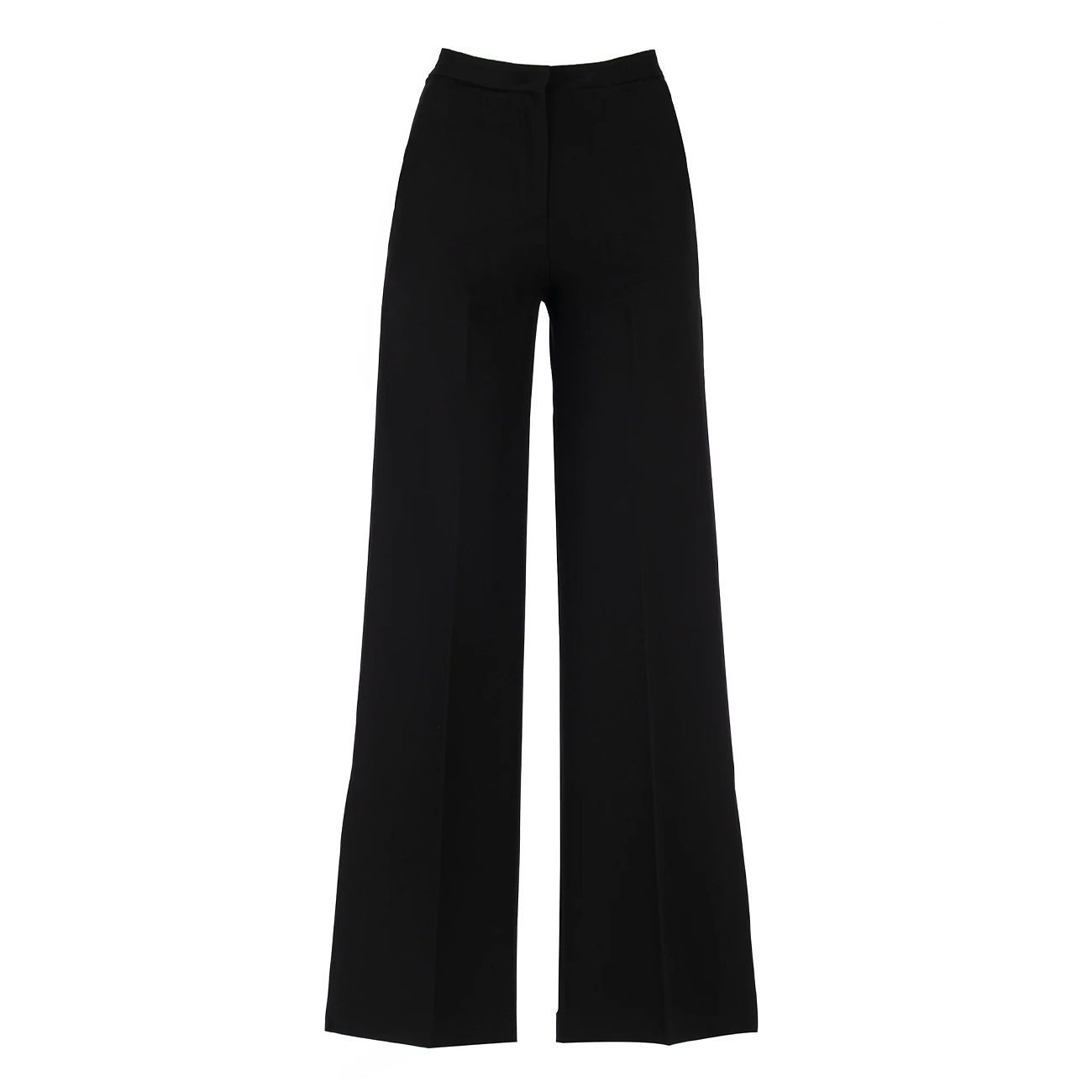 These palazzo-cut long trousers stand out for their fluid and sophisticated line, which slims the figure and gives a timeless elegance. The slanted pockets on the sides add a touch of practicality, maintaining a clean and tidy style. The hidden closure on the front helps define a minimal and refined aesthetic.