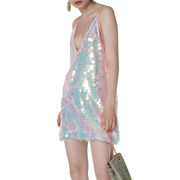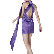 Solid satin dress in pastel colors strapless with v-neck on the front and deep v-neck on the back, a silver thread around the neck supports the dress and gives it a modern and innovative flavor.
