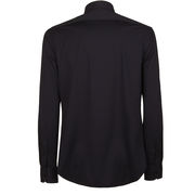 Long sleeved tailor fit shirt with central button closure. Presents open collar without buttons and pences on the back.